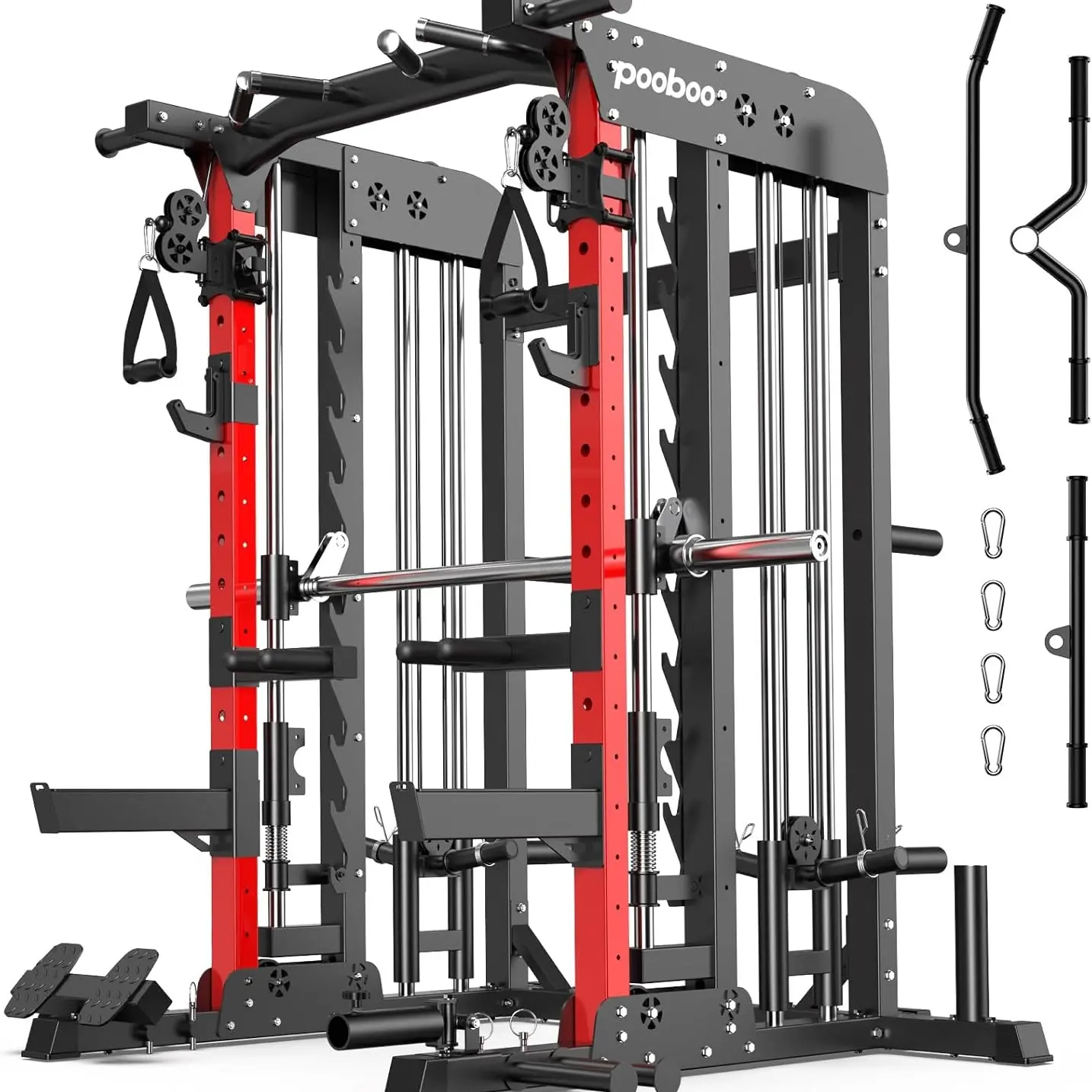 ·Experience top performance with the pooboo Squat Rack: featuring a precision pulley system with bearing pulleys and durable PU wire rope. It supports weights up to 1,000 pounds and ensures smooth, silent operation. Each metal component is polished using high-speed sandblasting for a sleek, burr-free surface. The environmentally friendly rust-proof paint adds protection, making this rack both functional and stylish for your home gym.