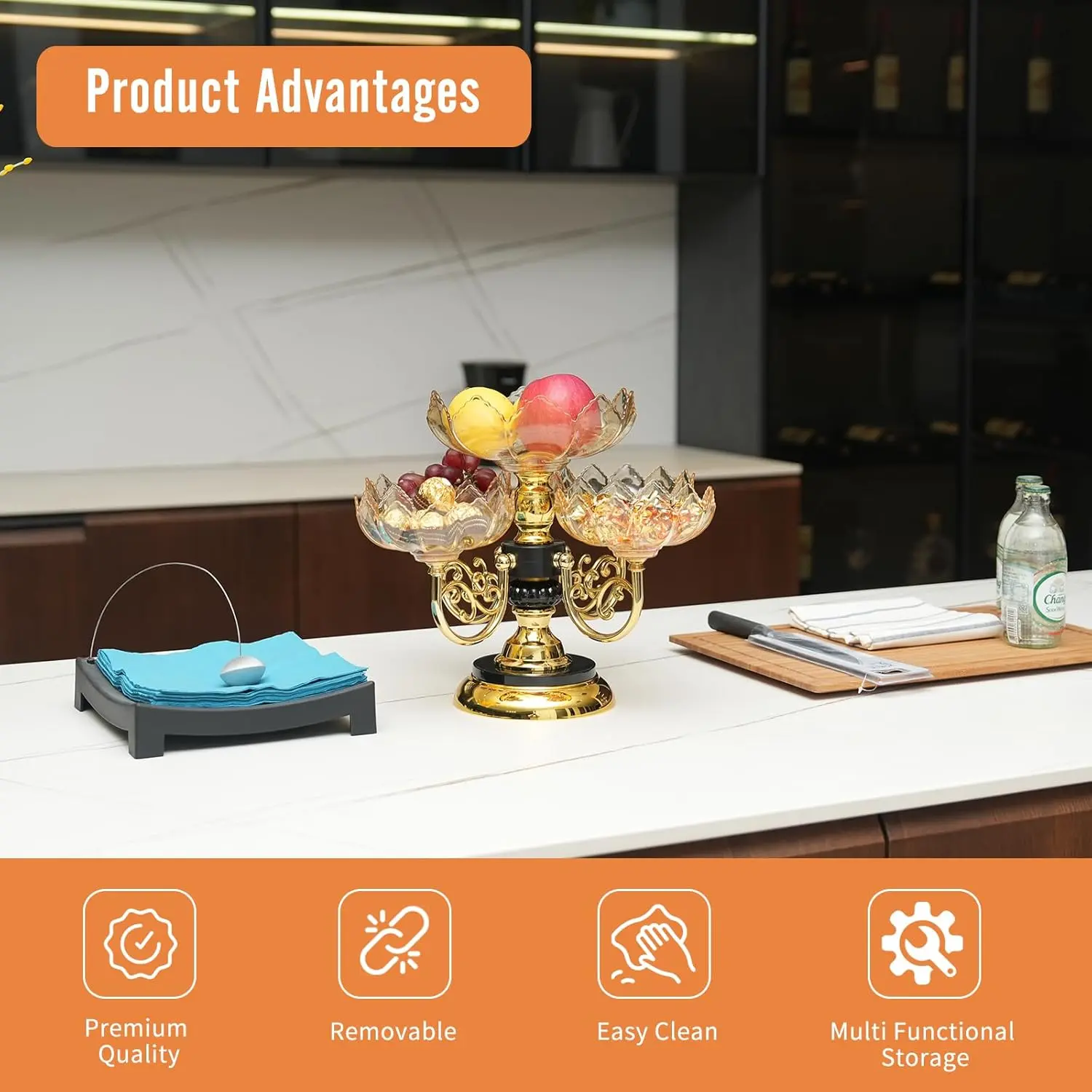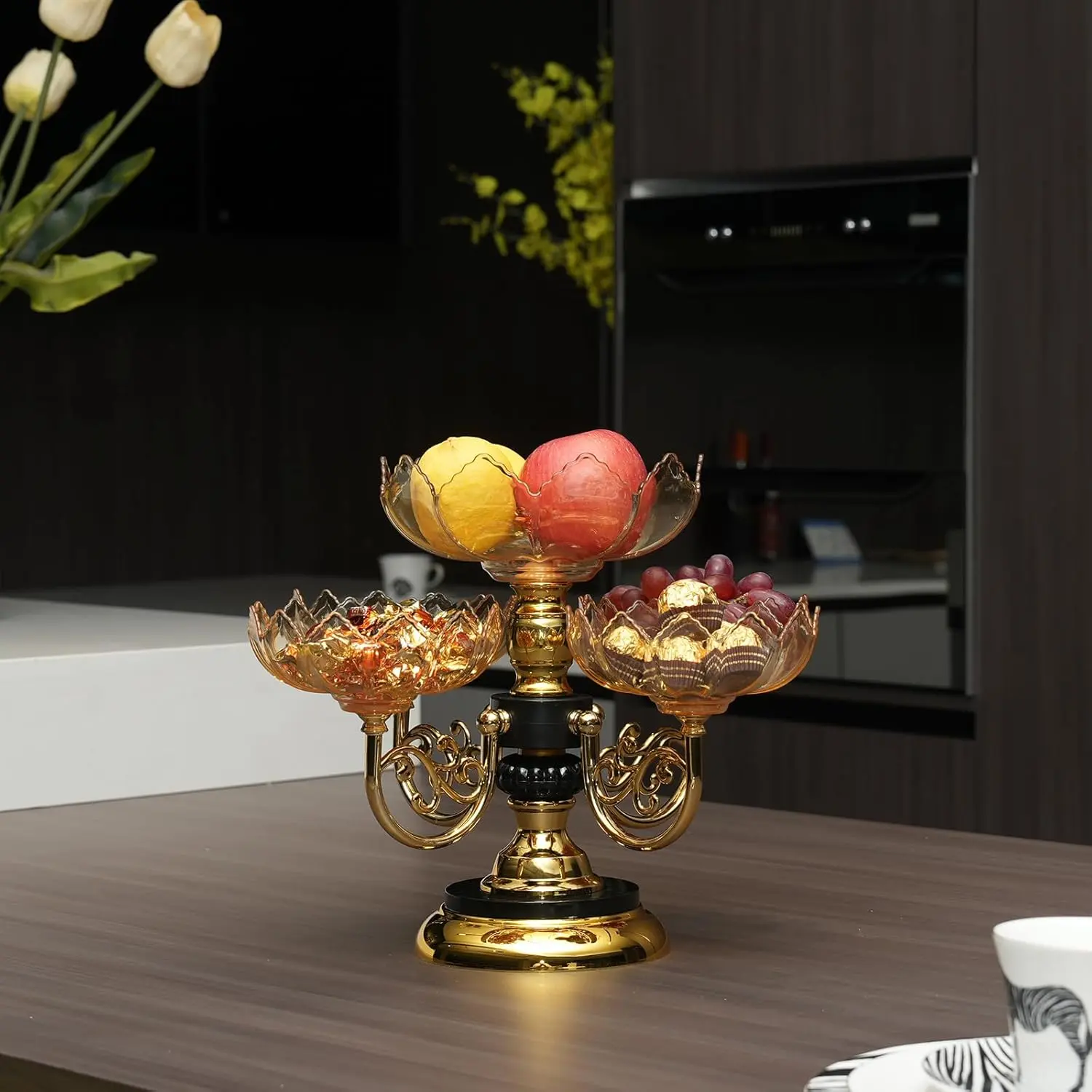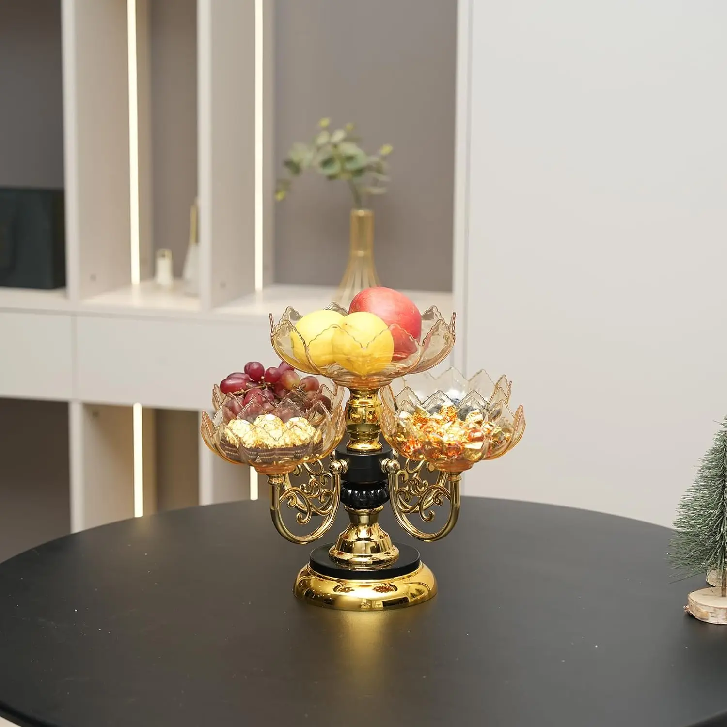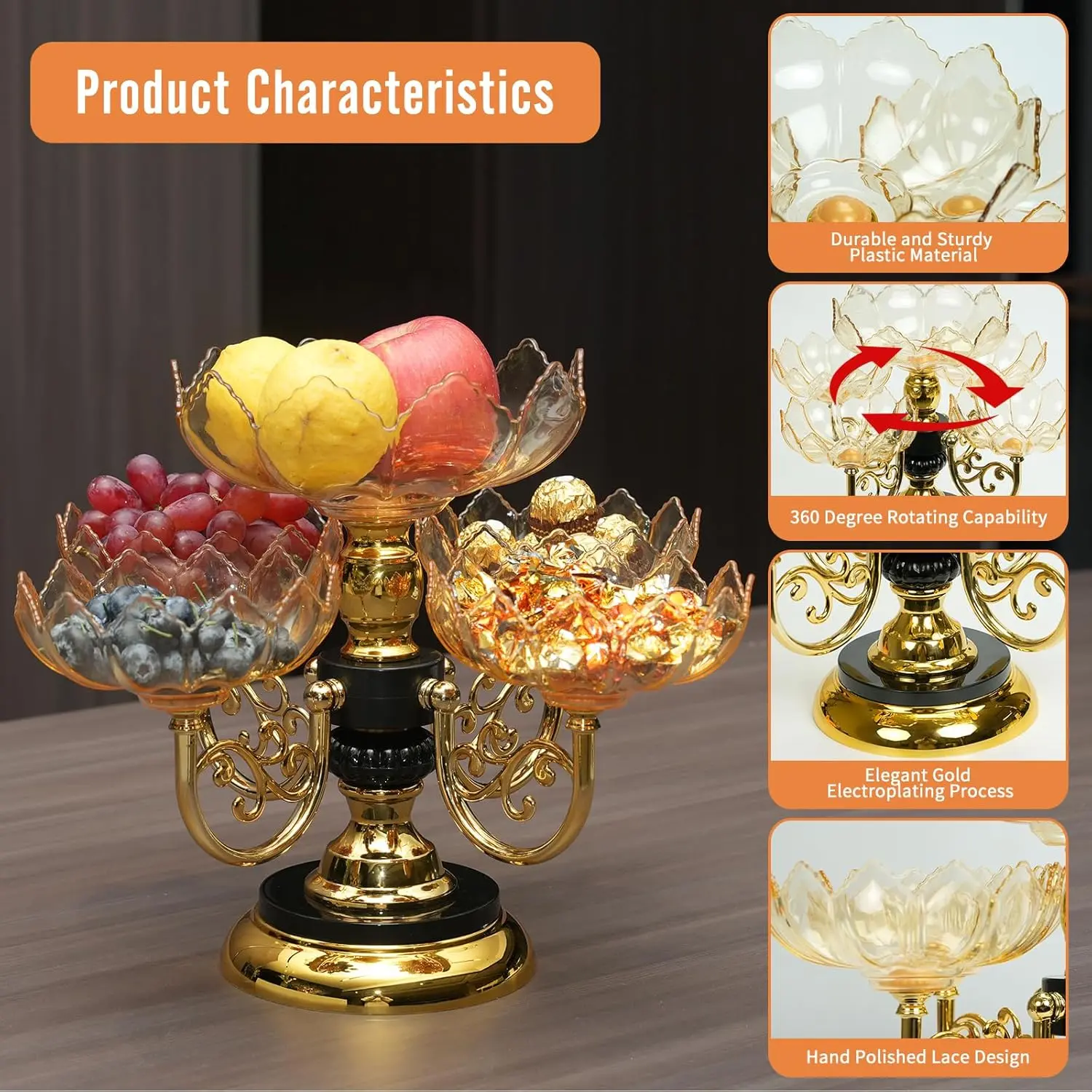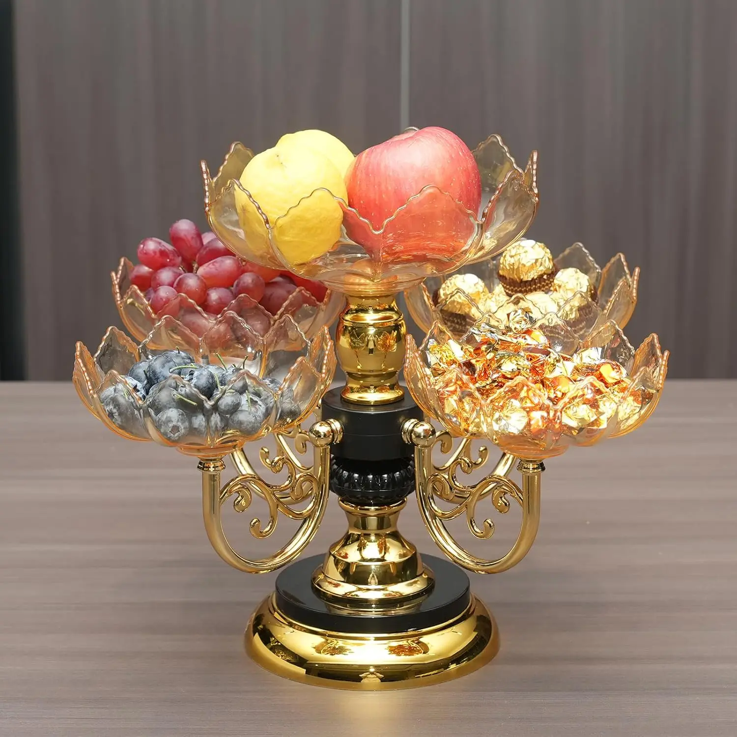 Sturdy Construction - This versatile fruit bowl is made of high-quality plastic material, its robust materials resist damage and deformation, ensuring reliable performance over time.The base surface is electroplated to make it resistant to fading, while the base is thick and smooth for more stable placement.Elegant Features - The exquisite petal coupled with a sturdy metal base not only adds elegance but also functionality to your dining experience.With a 360-degree rotating capability, this appetizer platter allows you to conveniently access your fruits from any side, enhancing guest interaction.Its smooth surface ensures easy cleaning, so you can spend less time maintaining and more time enjoying.Multifunctional storage - This exquisite fruit tray is designed with one main and four small sub-plates, which can hold fruit, cake, candy, snacks, etc., the transparent texture sets off the beauty of food.Each plate separates the food so that it is stored independently.Perfect - Elevate your home decor with our versatile fruit basket, designed to enhance any setting.Its sleek modern aesthetic makes it a standout feature on kitchen counters, dining tables, or coffee tables.Beyond just a fruit display, it’s perfect for showcasing candies, bread, or decorative items, making it an essential accessory for homes, restaurants, and special events alike.Multi-scenario Use - The fruit bowl isn't just a practical item, also a statement piece suitable for various occasions. Whether hosting a dinner party, celebrating a wedding, or simply enjoying family gatherings, this bowl adds sophistication to any event. Its combination of practicality and style makes it an ideal gift for housewarmings or holidays, ensuring your loved ones celebrate in elegance.