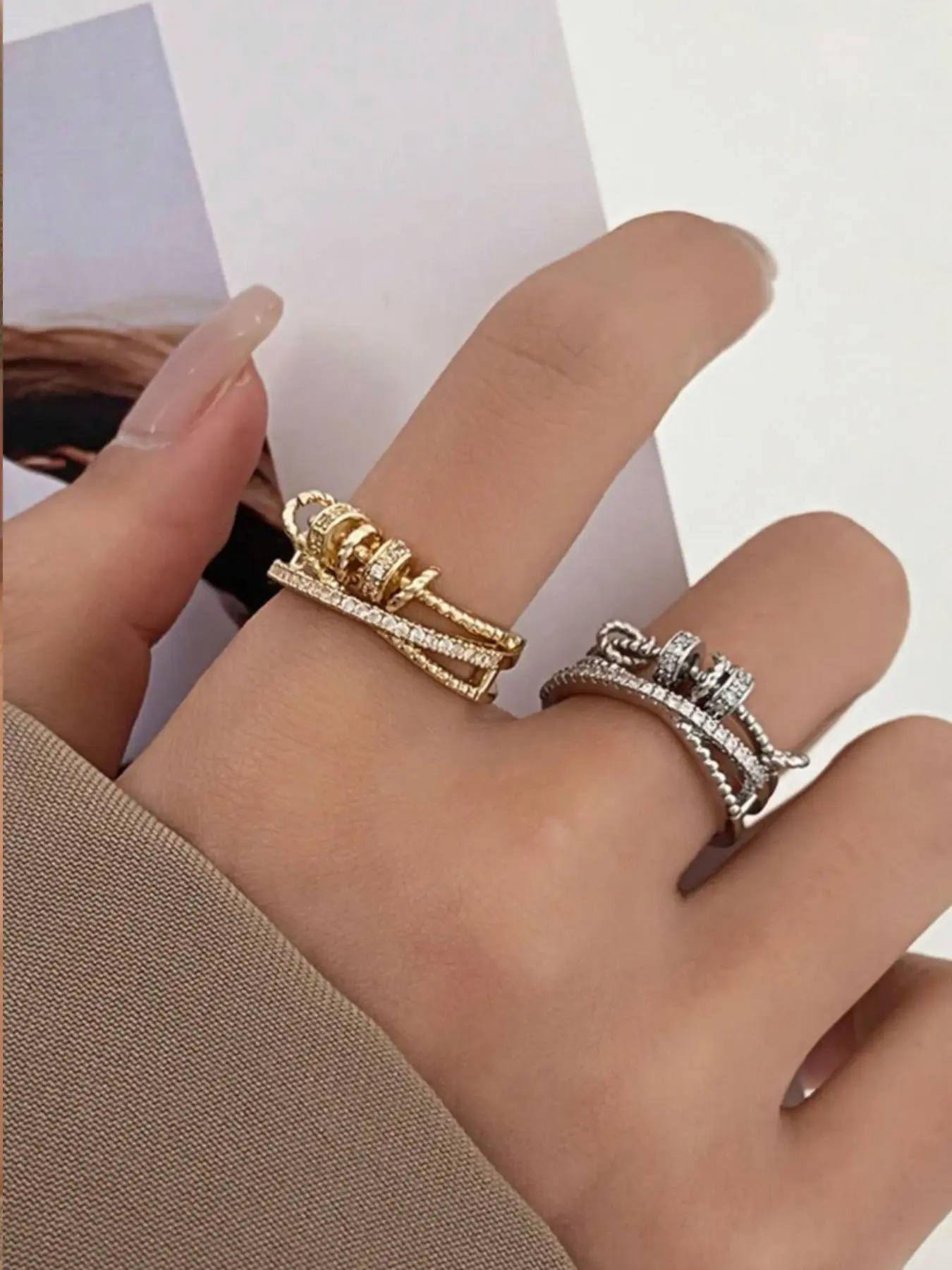 Multi-layer Rotating Cross Design Ring, Rhinestone Inlay Adjustable Anxiety Relief Fidget Spinner Ring, Fashion Jewelry Accessories for Women
