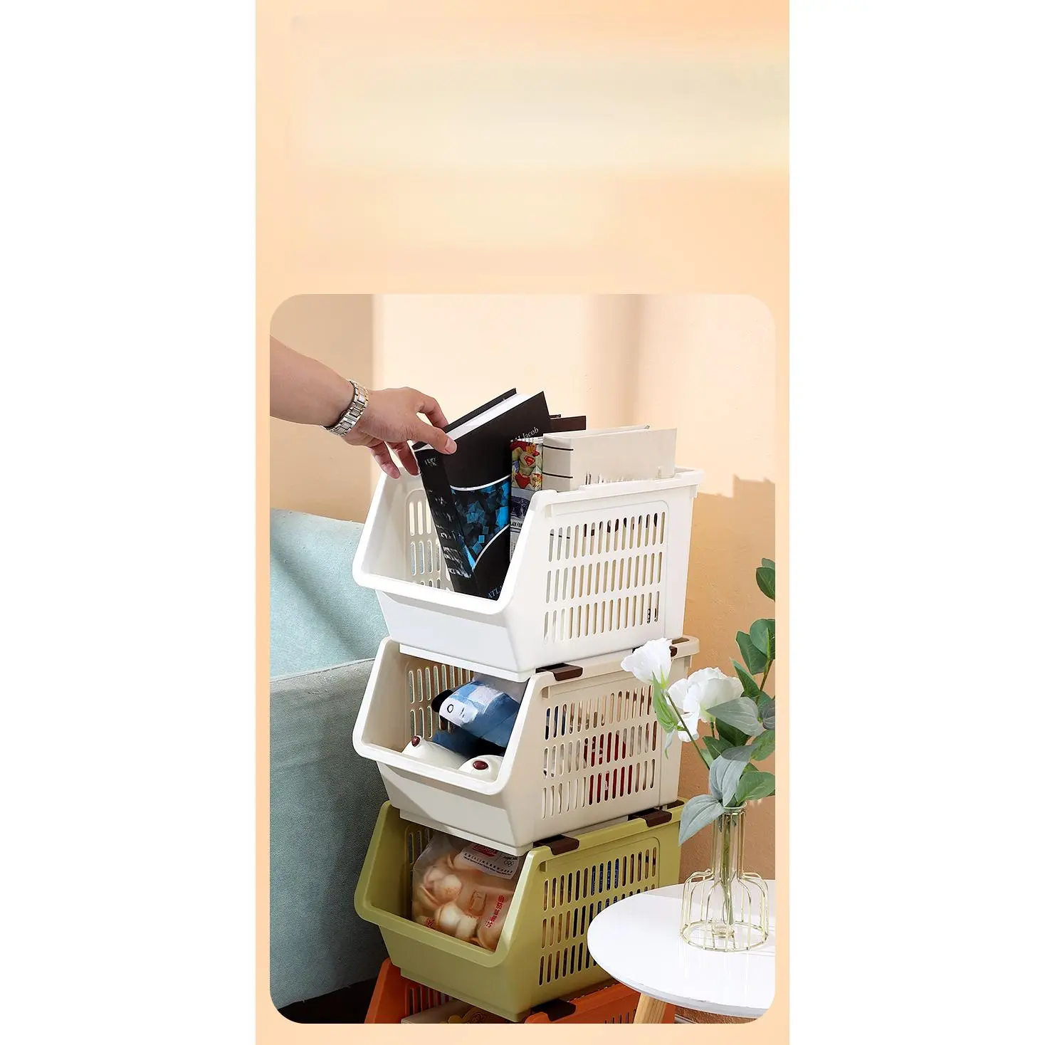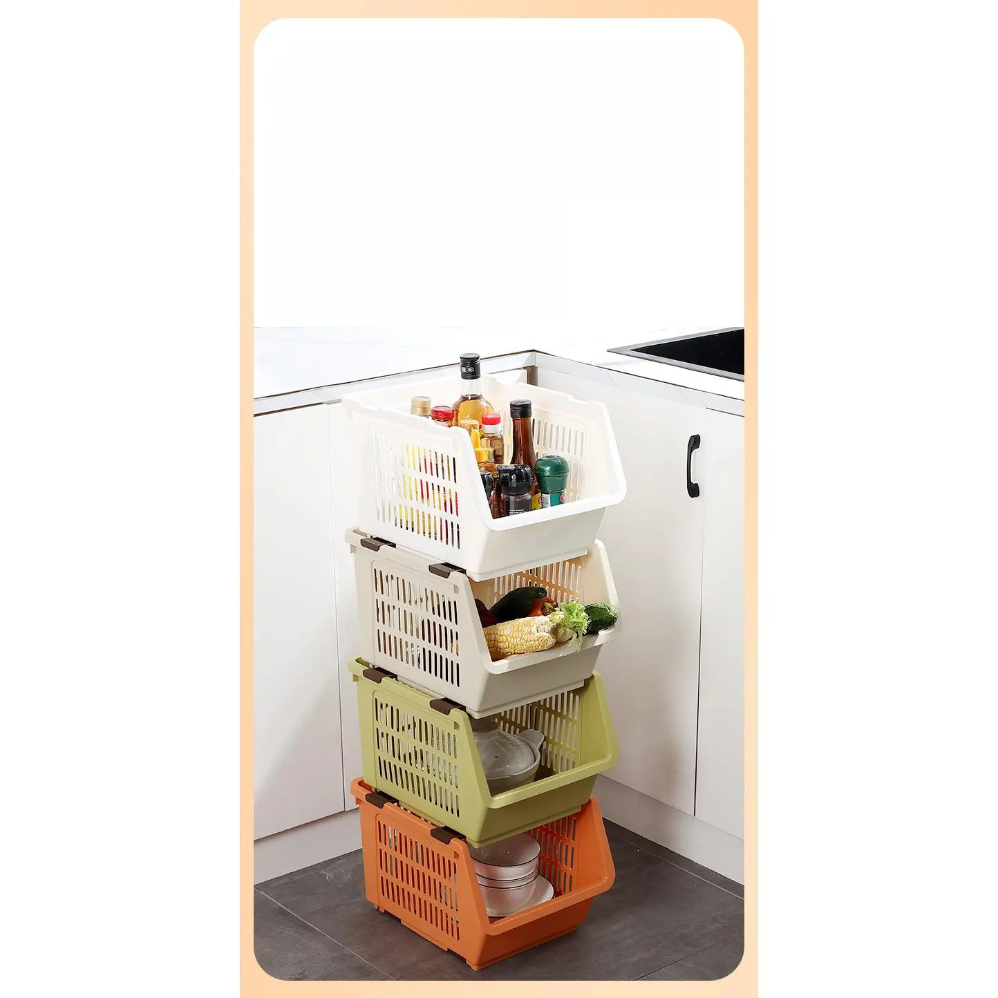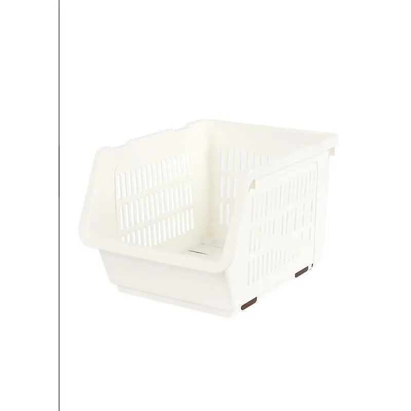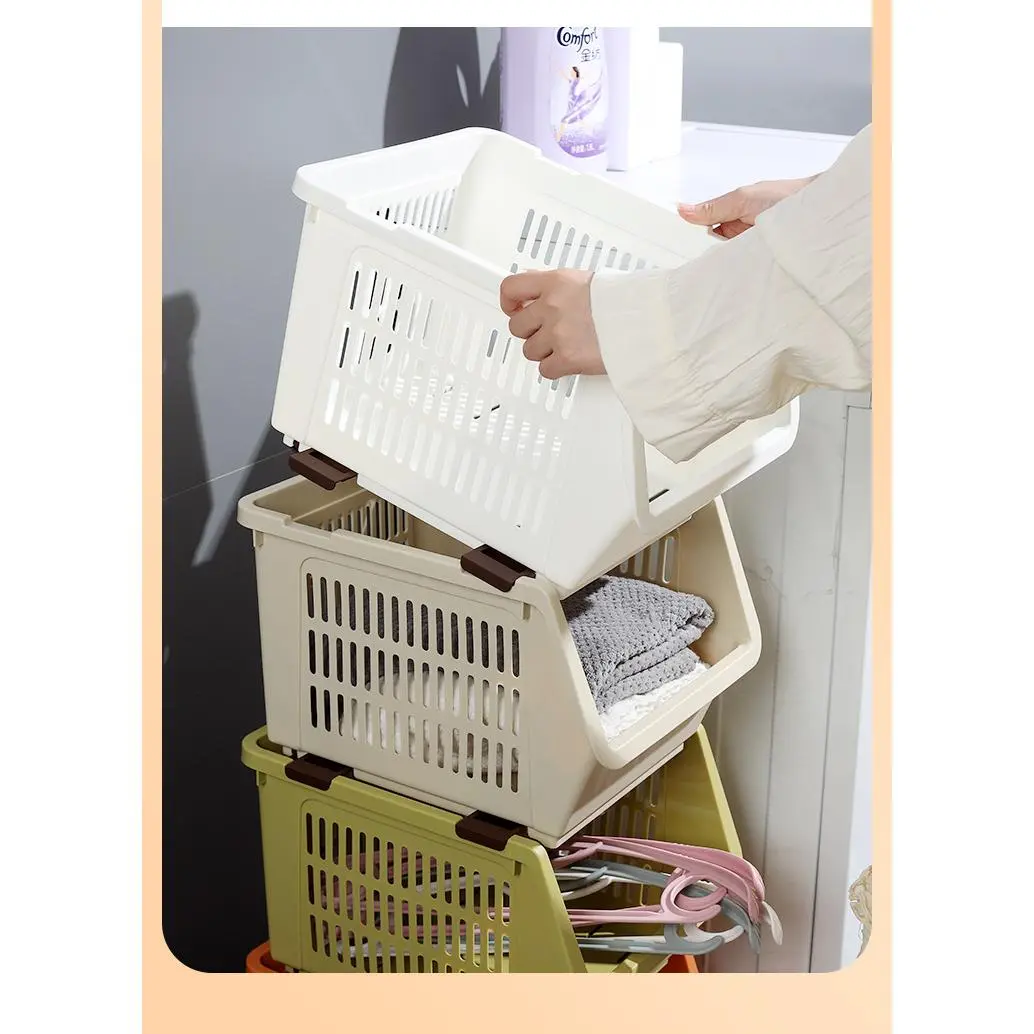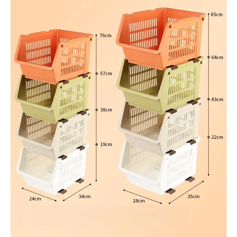 , available in two sizes: small (24cm*34cm) and large (28cm*35cm).You can stack them flexibly according to your space and storage needs, maximizing vertical space utilization.The slant-opening design allows items to be seen at a glance, making access extremely convenient.The hollow basket body is ventilated and breathable, moisture-proof and mildew-proof, suitable for storing vegetables and snacks in the kitchen, and organizing toiletries in the bathroom.