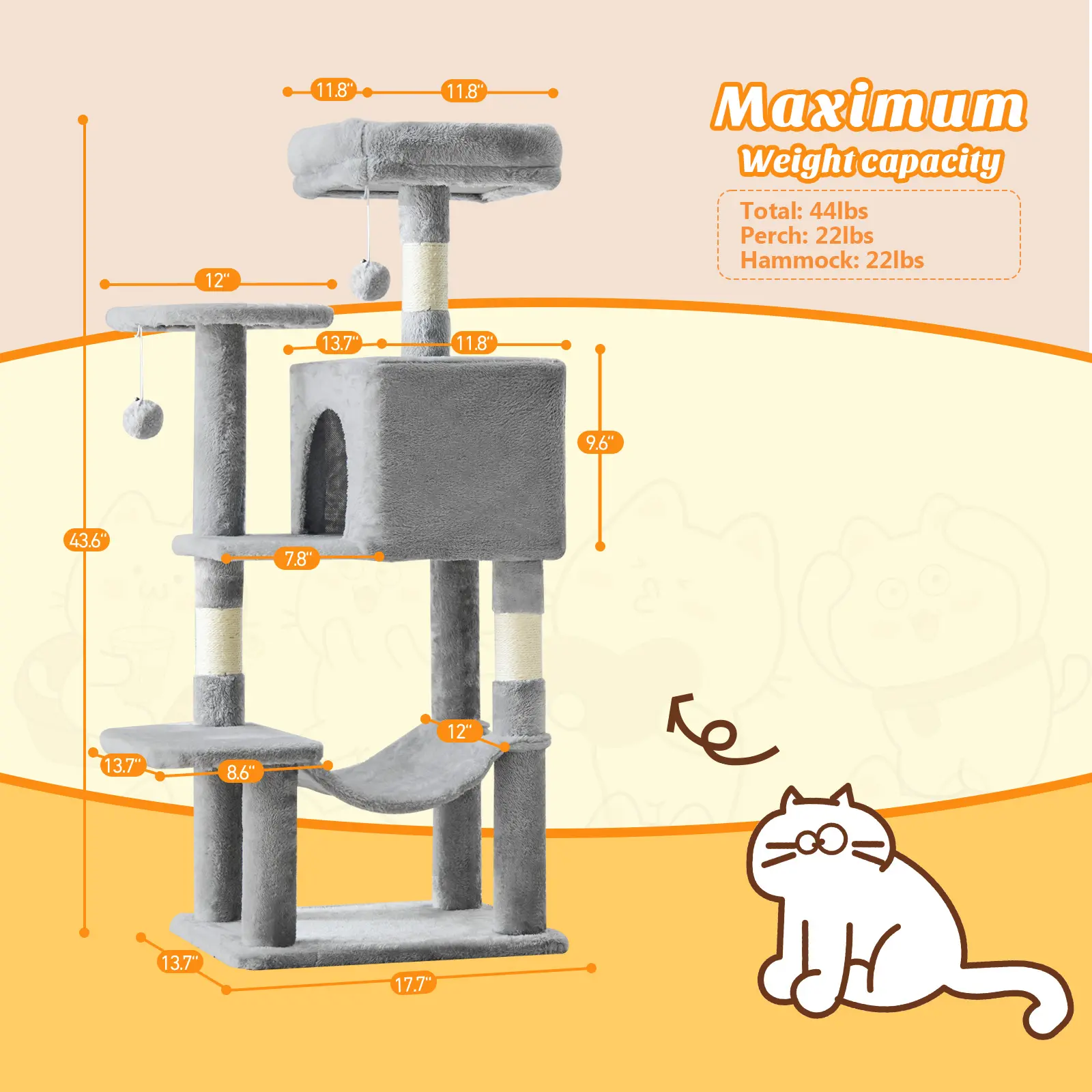 ·Multi-Level Cat Tree: Multi-zone design caters to feline play needs, specifically crafted for multi-cat households. 44 inch cat tree accommodates 2-3 cats for simultaneous play and relaxation. Features include a cat condo, 2 swinging balls, 2 extended platforms, hammock, and scratching posts, satisfying your cat's instincts to climb, perch, and hide while delivering endless fun