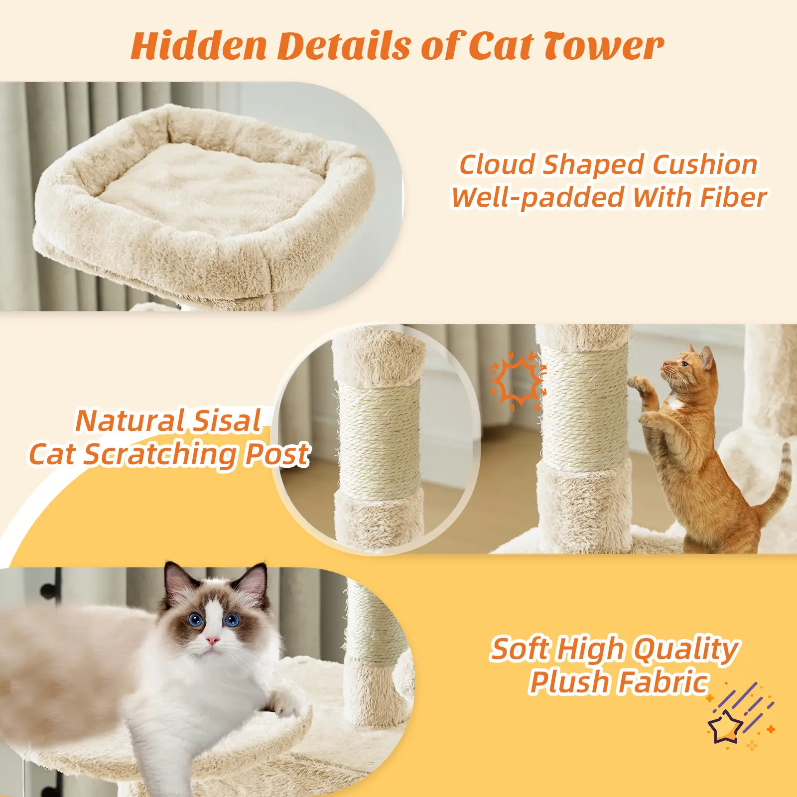 ·Multifunctional Cat Tower: Indoor Cat tree deeply integrates cats' natural instincts with furniture protection, combining a cozy cat condo, hammock, dangling balls, and scratching posts. It satisfies cats' climbing and claw-sharpening needs while reducing furniture damage. Scientifically channeling your pet's energy, it truly achieves a harmonious coexistence between humans and pets