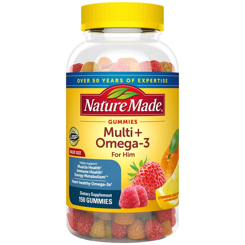 Men, start your day with two delicious gummies that support muscle health, immune health, and energy metabolism‡ plus 60 mg of heart-healthy Omega-3s.†