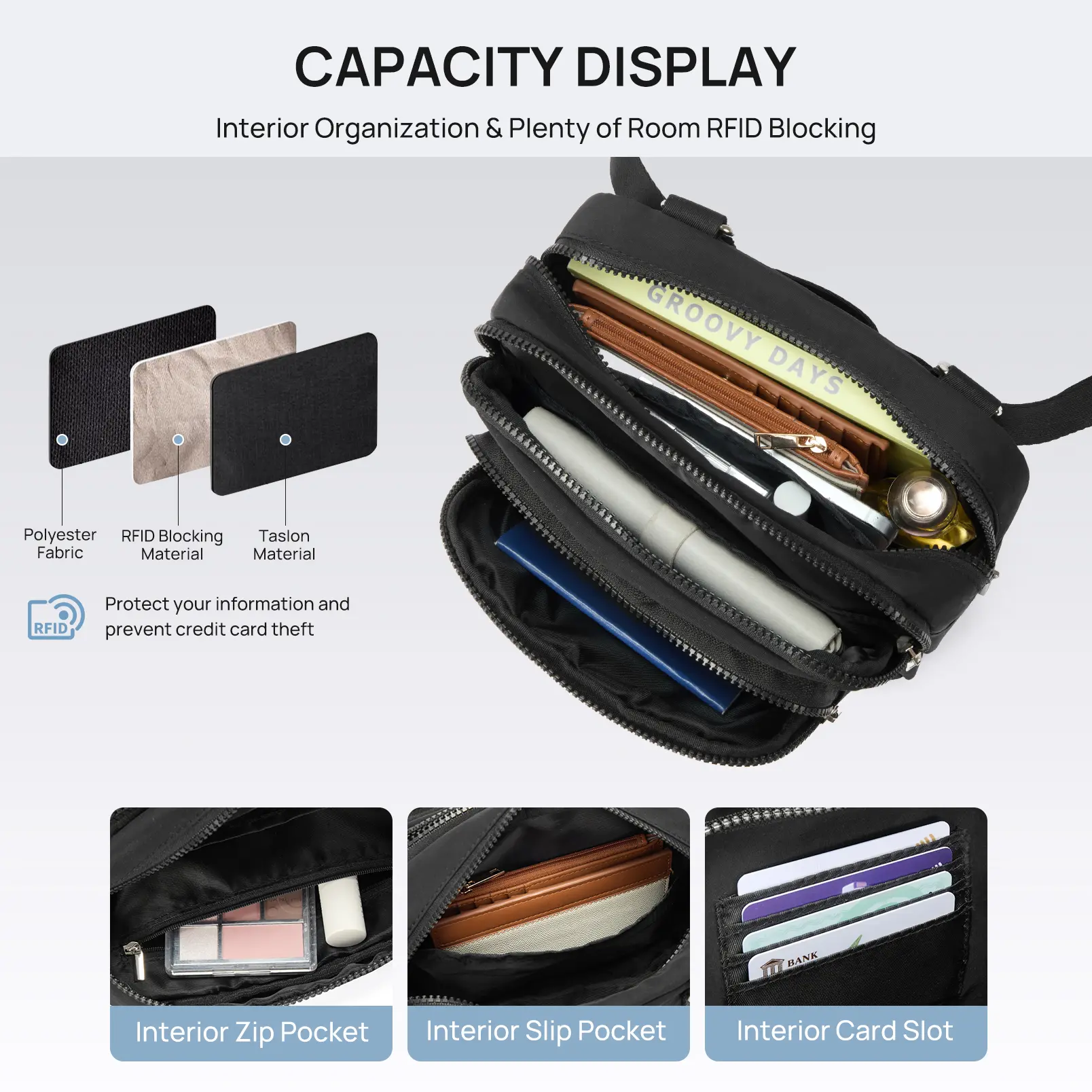 ·Stay Organized & Secure: Keep essentials tidy across 3 smart compartments! Front section features 4 card slots + RFID shielding to block digital theft. Fits your phone, iPad Mini, Kindle & wallet with ease