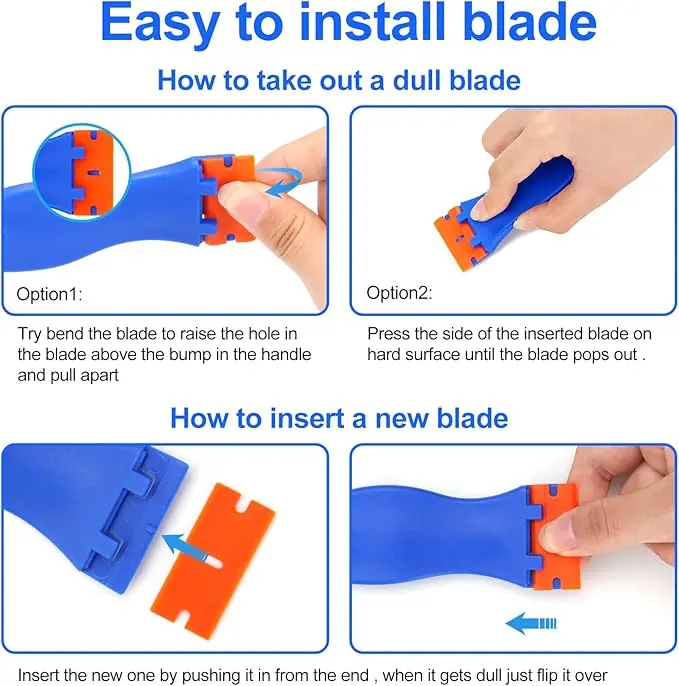✨ Plastic Razor Blade Scraper set includes 2PCS scraper tools with 100PCS plastic blades. Perfect for cleaning and removing stickers, decals, adhesive, labels, paint, glass, car, window, and caulk. This tool ensures no scratches during use. Ideal for various cleaning needs around the home or car.