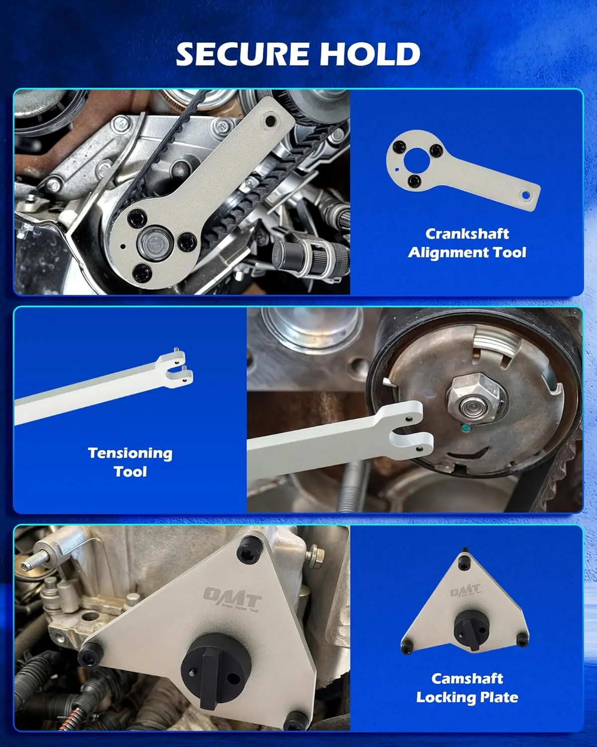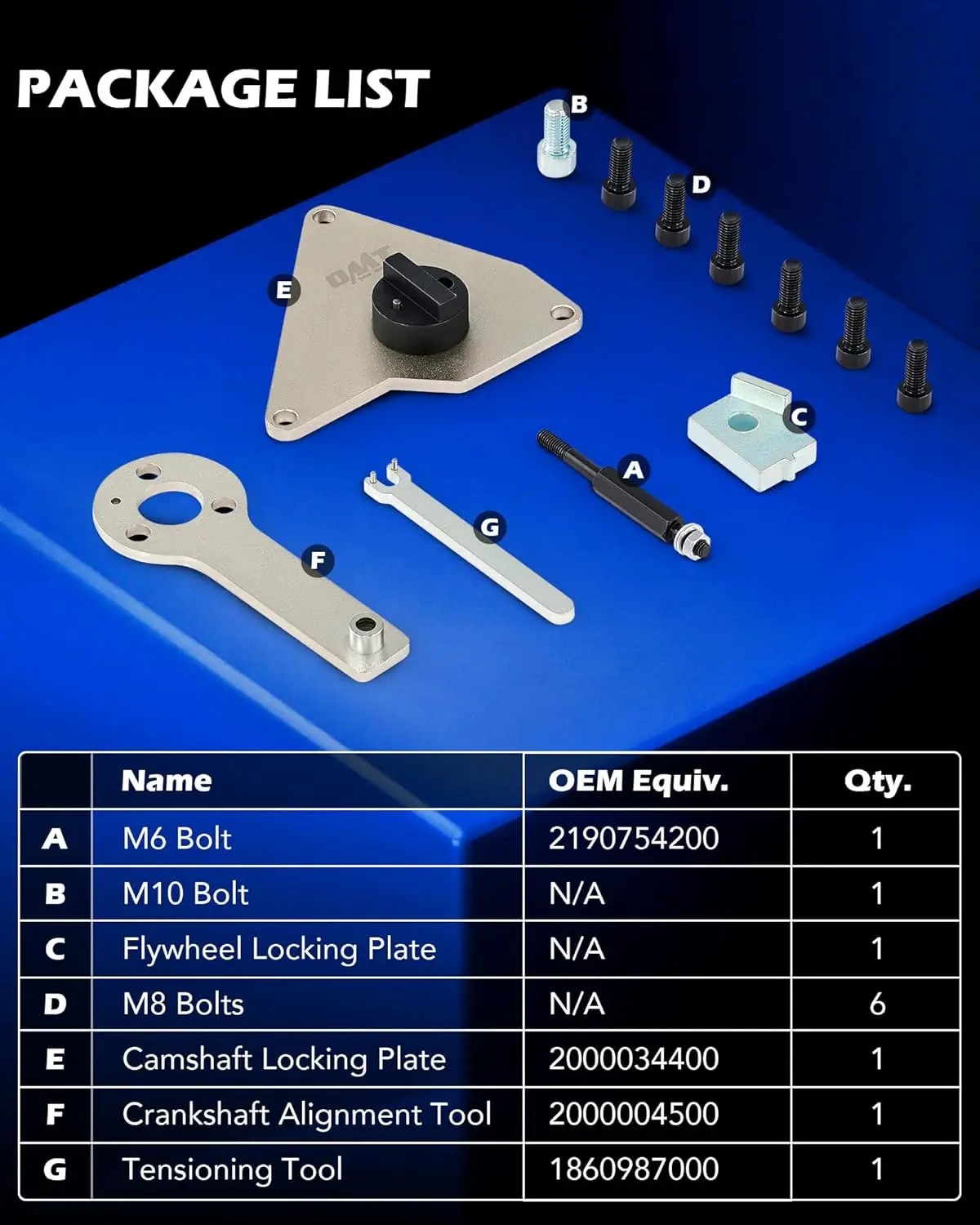 This OEM equivalent engine timing belt tool set comes fully equipped with a crankshaft alignment tool, camshaft locking plate, flywheel locking plate, tensioning tool, and matching bolts for engine timing service