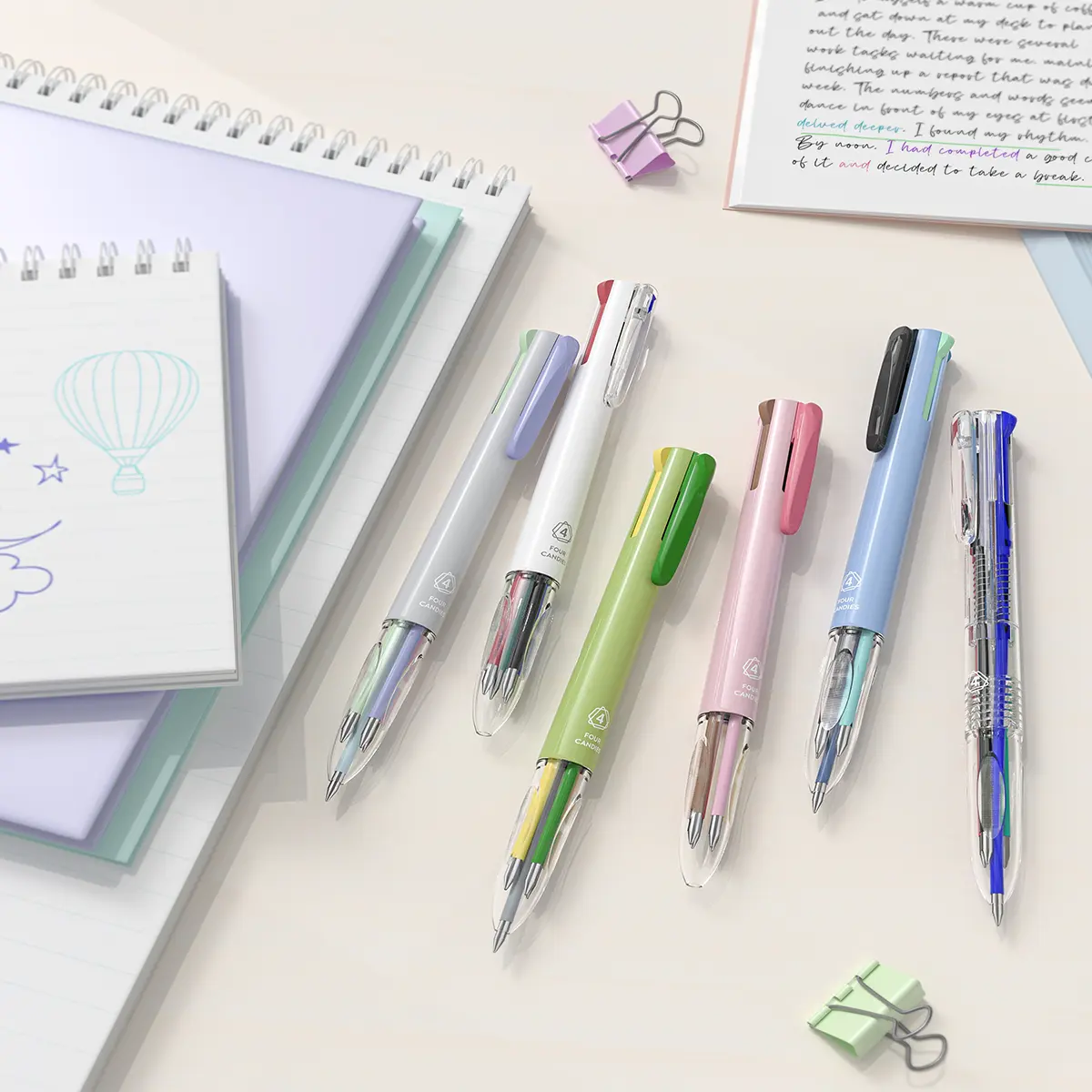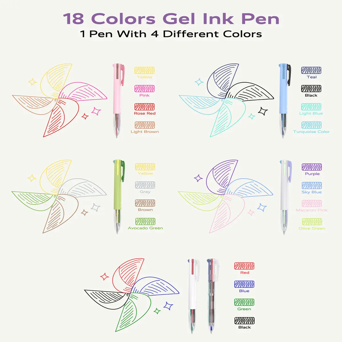 Four Candies 6PCS Multicolor Pen 0.5mm 4-in-1 Colored Pens 18 Colors Retractable Ergonomic Design for Students Nurses Office Supplies