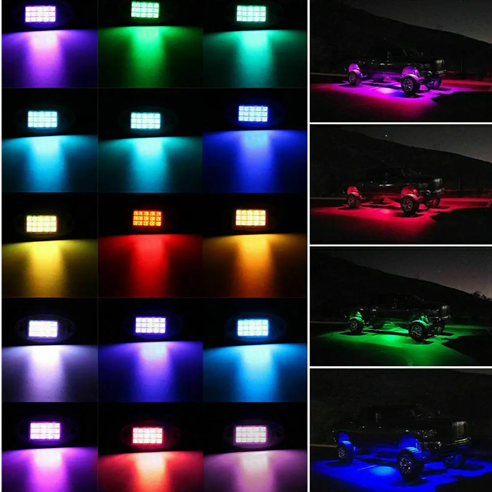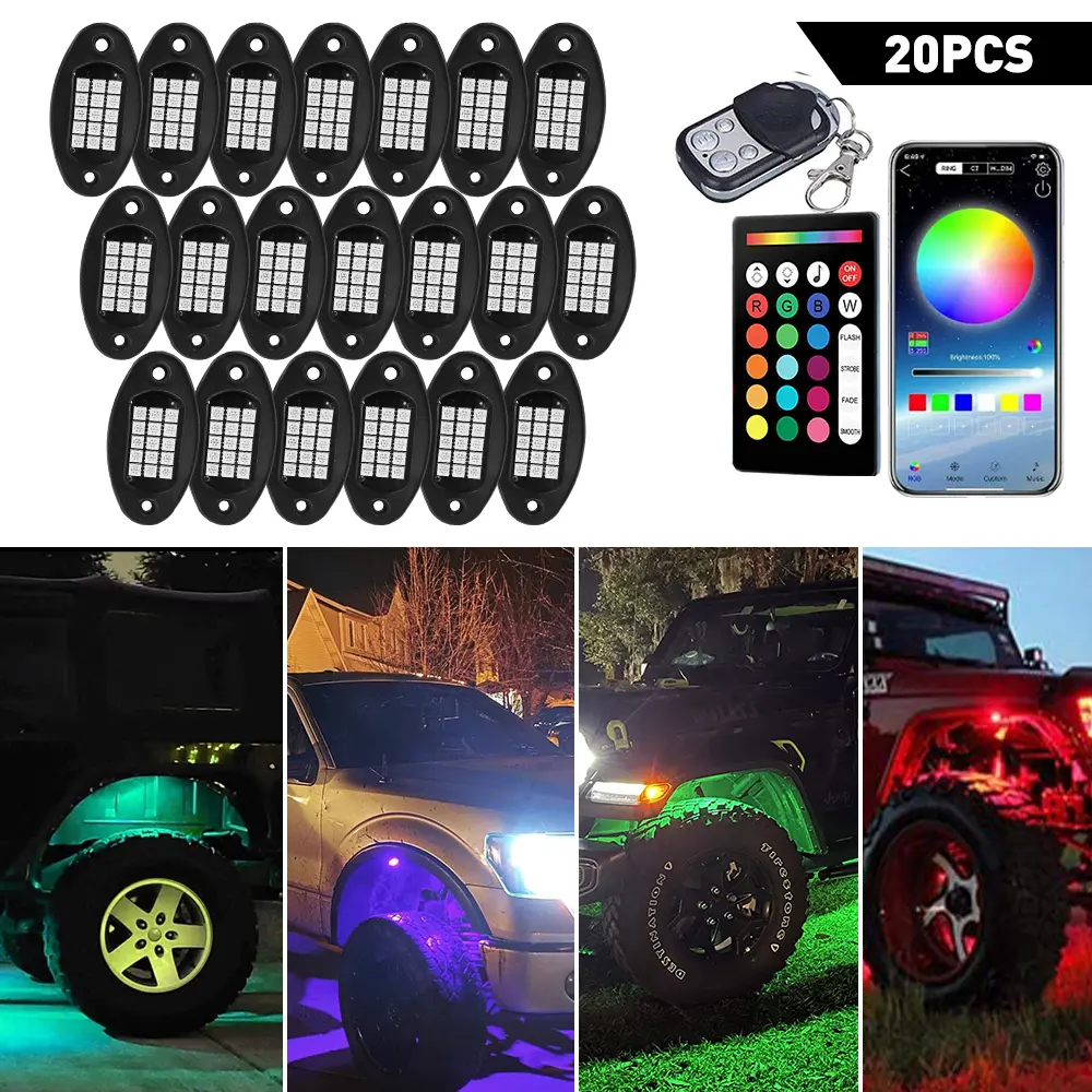 20 Pods With High Quality Chip: 15 unit hight brightness 5050 Muilticolor LEDs for each pod, 150° super wide-angle lights, provide quality light output of LED rock lights, bright and uniform.