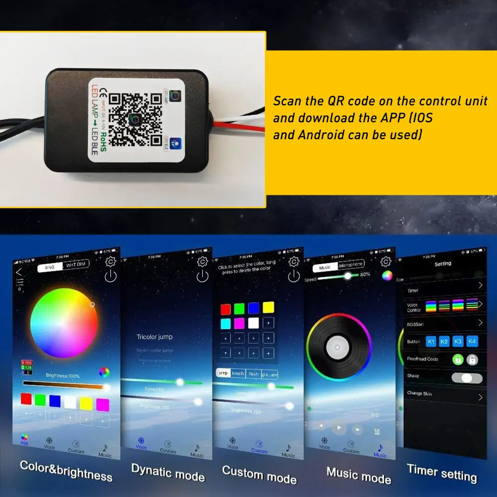 3 Control Modes: 4 keys & 24 keys remote control, APP control to avoid connecting issues, which you can adjust the change speed, brightness and stroboscopic speed. You can control more than 2 sets of rock lights together.