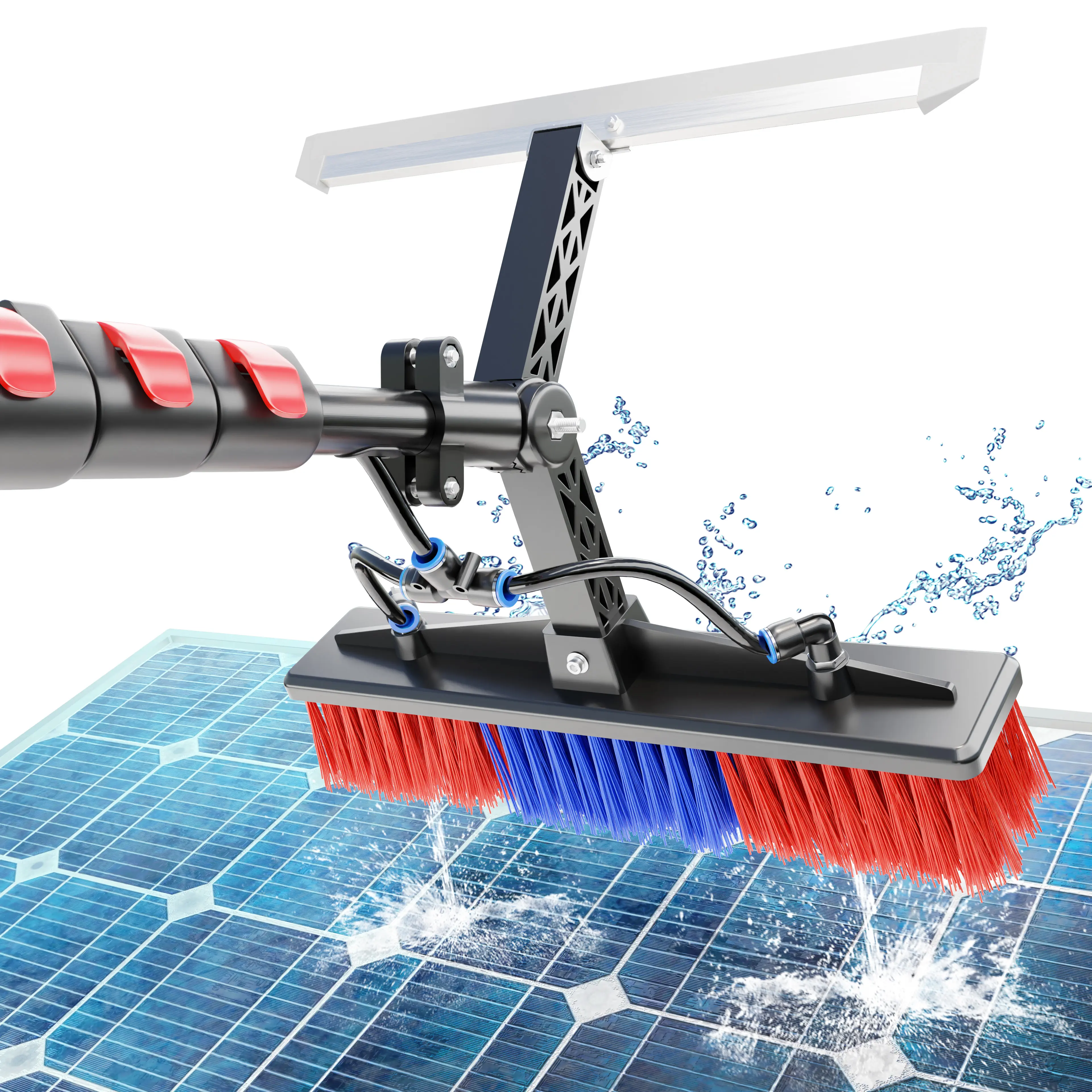 Efficient Water-Fed Brush: The multi-angle adjustable brush head, combined with water flow, easily rinses away debris, keeping your solar panels clean and efficient