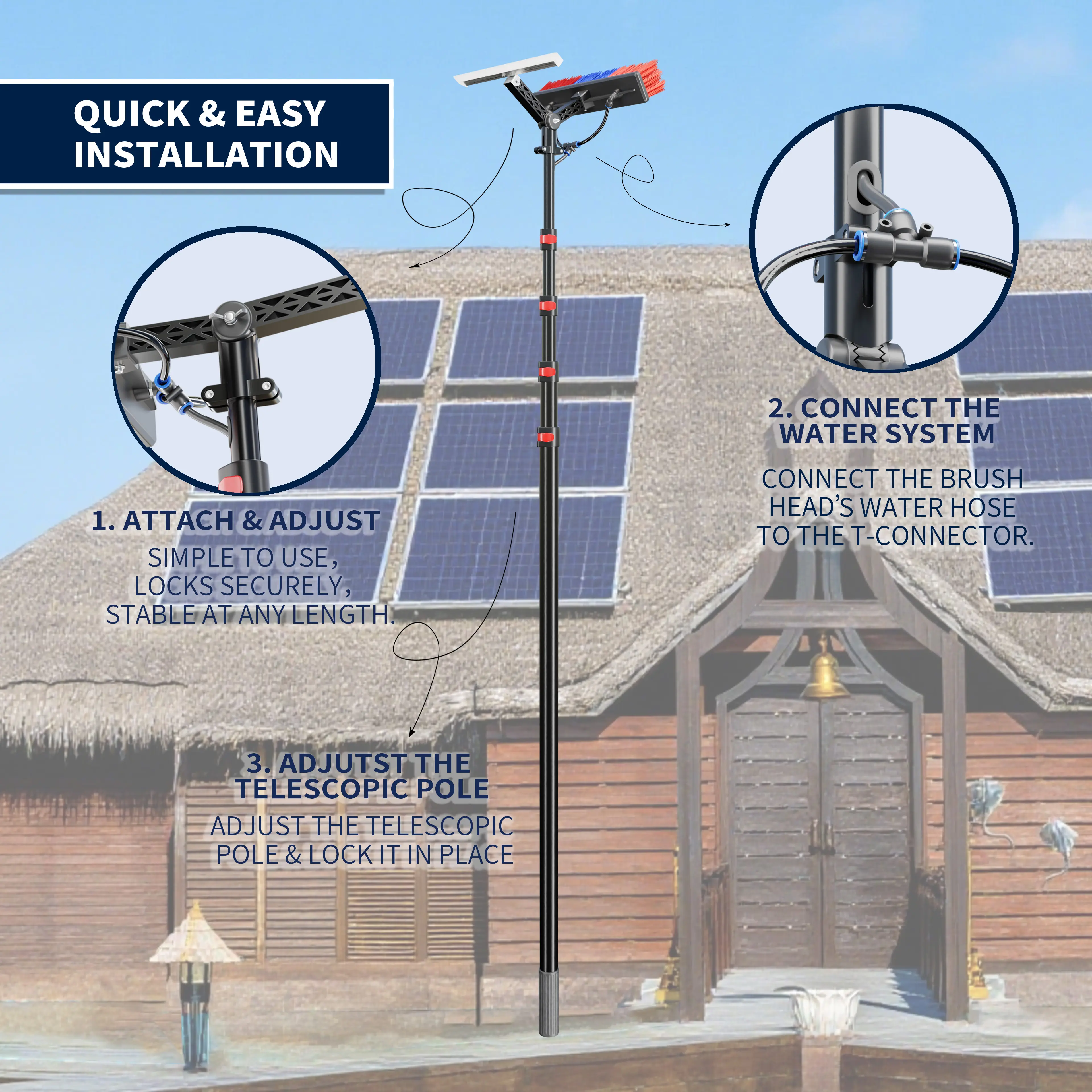 Easy Solar Panel Cleaning: This water-fed cleaning kit is designed specifically for solar panels, removing dirt, dust, bird droppings, ash, and even light snow, helping to maintain your panels' performance and appearance