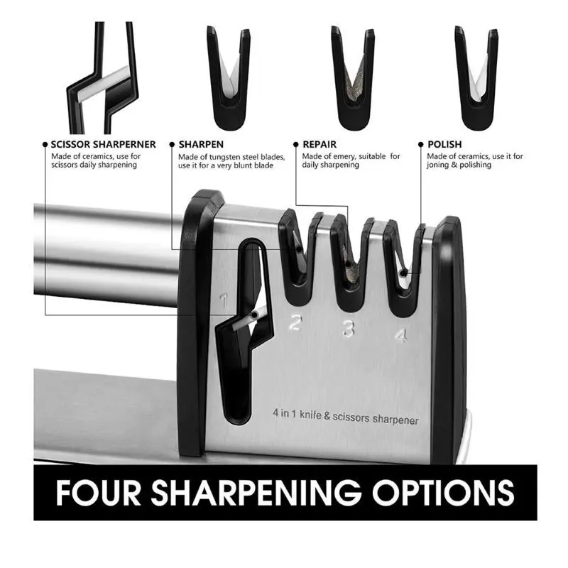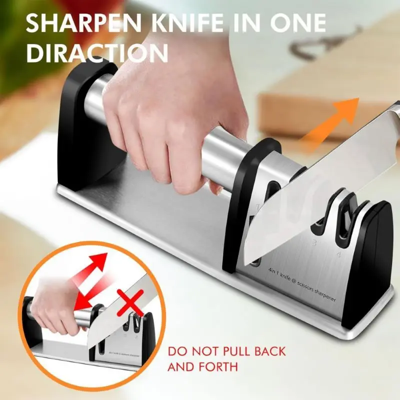 This multifunctional knife sharpener offers quick and efficient sharpening with a handheld design. Available in silver and red styles, it is suitable for various kitchen knives. Made of metal and plastic, it ensures durability and ease of use.
