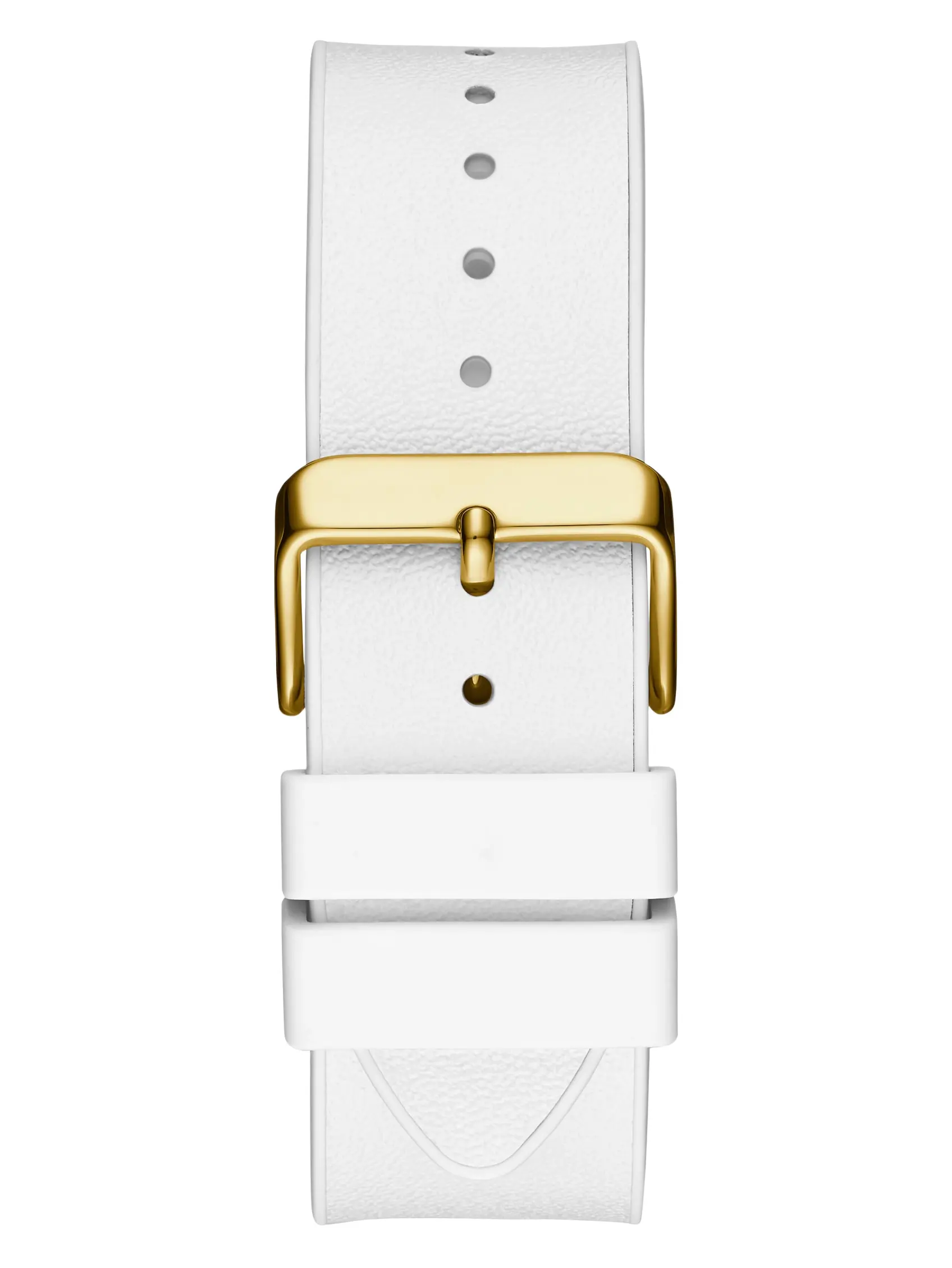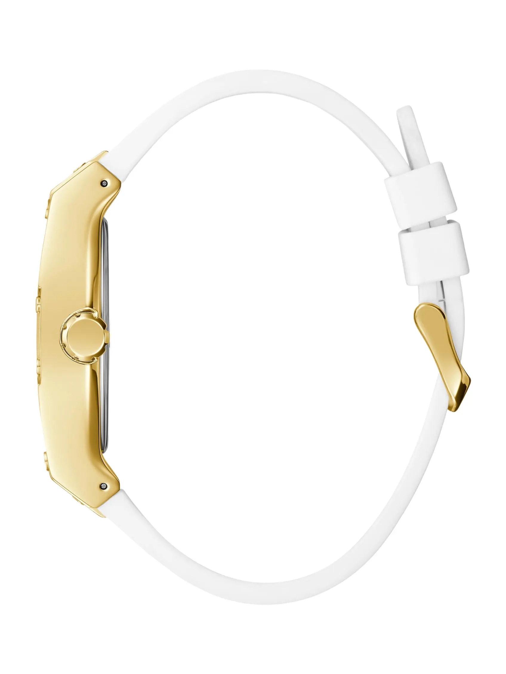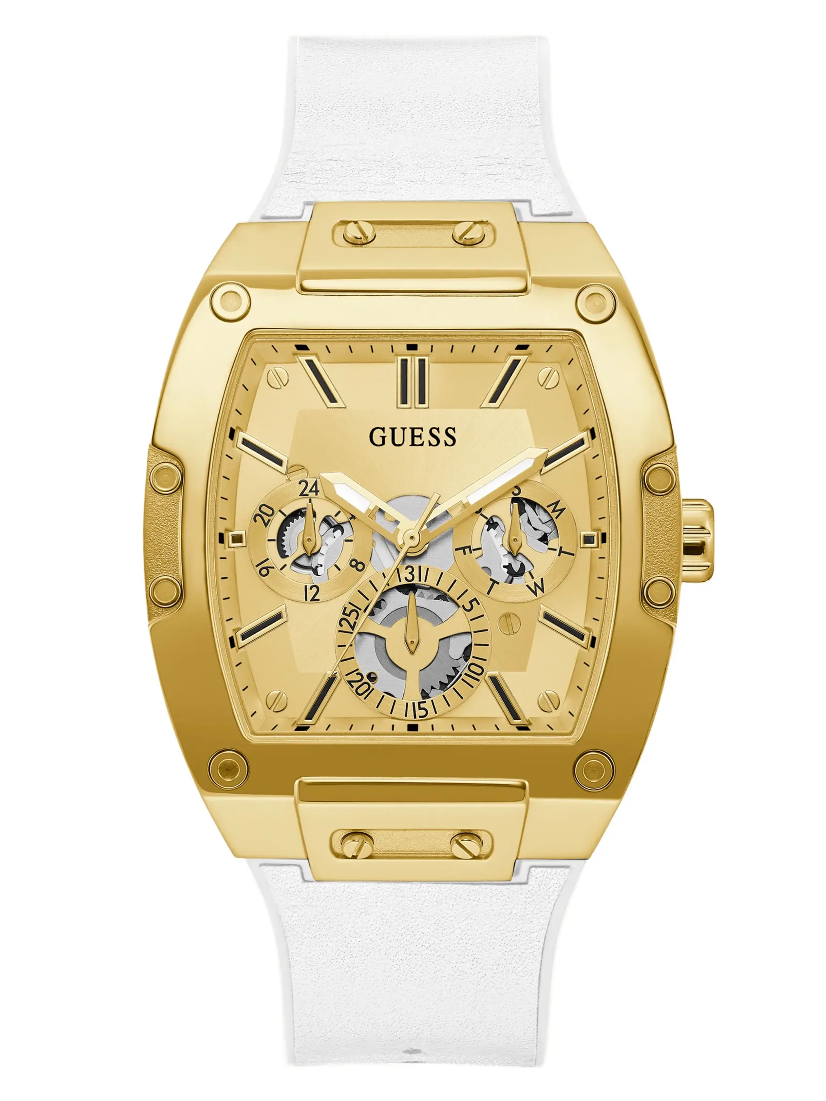 5. GUESS Male Gold-Tone and White Rectangular Multifunction Watch