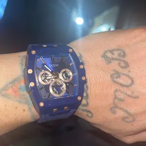 5. GUESS Male Rose Gold-Tone and Blue Silicone Multifunction Watch