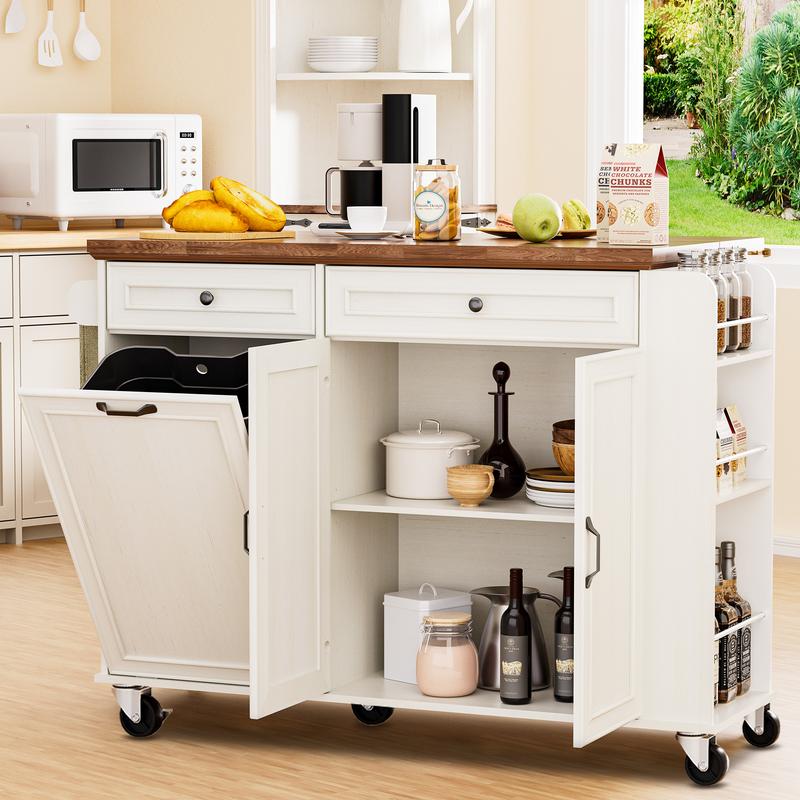 ·【All-in-One Organization Hub】Tired of kitchen clutter? This kitchen cart is your ultimate organizer! The clever tilt-out trash bin cabinet hides waste discreetly, while the spacious interior offers: 2 Smooth-Gliding Drawers: For utensils and linens. Large Cabinet + Adjustable Shelf: Store pots, pans, or bulk items. 3 Side Spice Racks & Towel Bar: Keep essentials within arm's reach. Achieve a clean, streamlined look effortlessly.