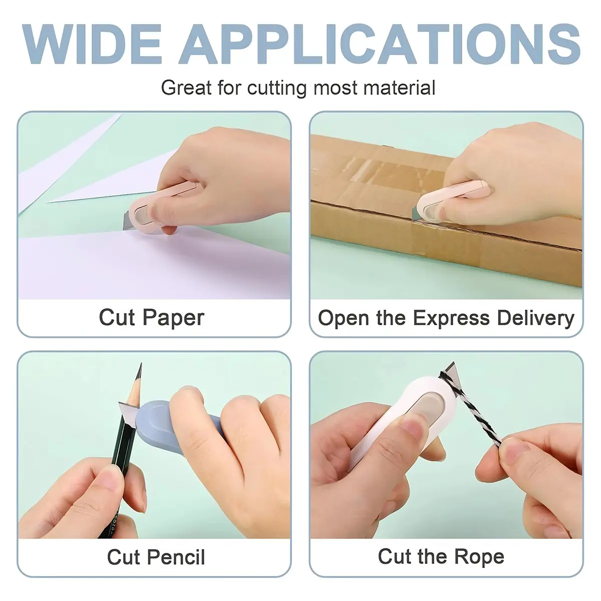 Versatile Design: The box knife is not only for commercial use, but also for hobbies, it can cut a variety of materials such as card stock, mat board, foam board, cardboard, photos, coupons, thick paper, tape, and plastic, and UPS, Amazon, or post office packages.