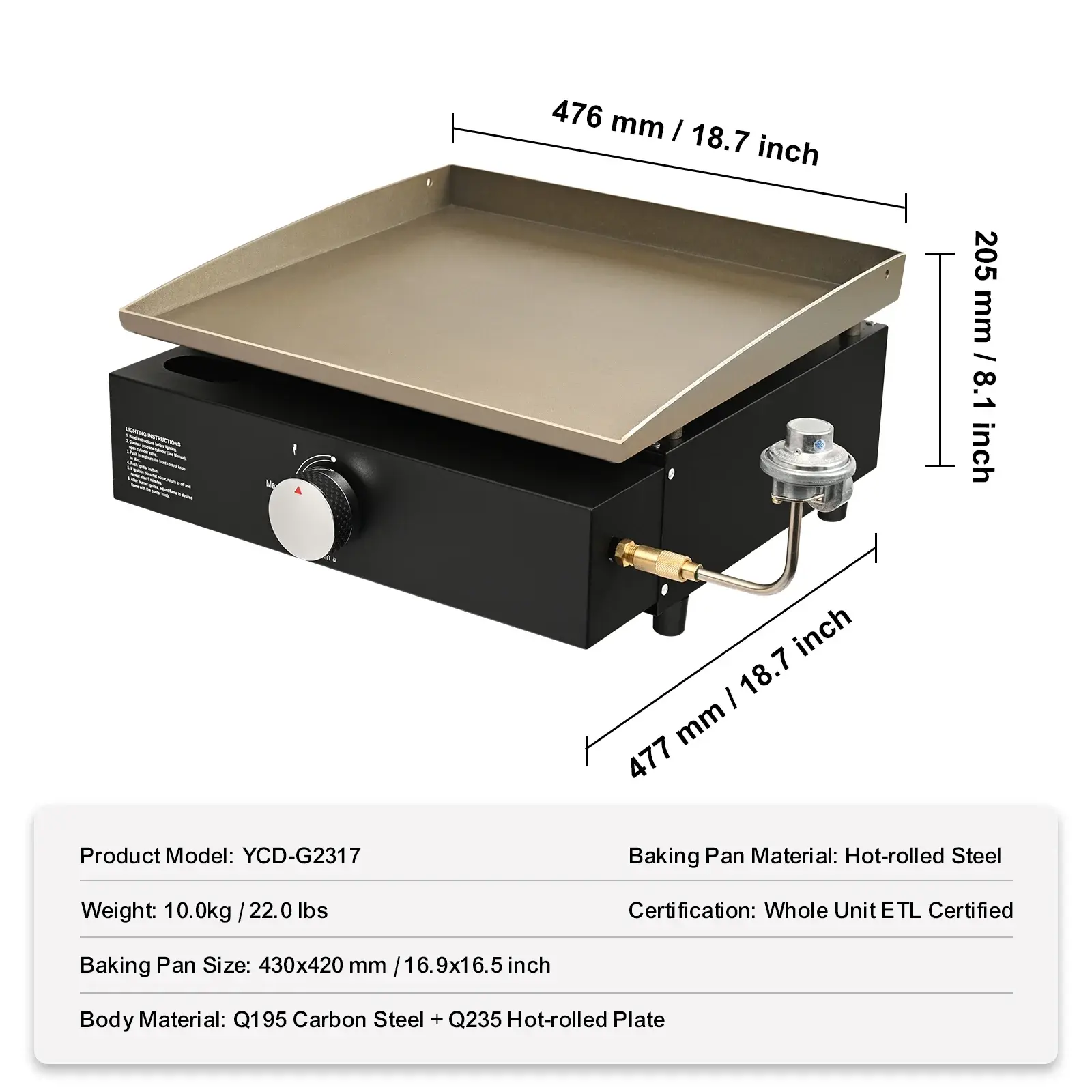 Discover the versatility of outdoor cooking with our 17-inch (431.8mm) single-burner gas griddle. Designed for even heat distribution, it ensures consistent results whether you're searing, frying, or grilling a variety of dishes. The generous cooking area is perfect for preparing meals for gatherings, while the built-in grease tray makes cleanup quick and hassle-free.