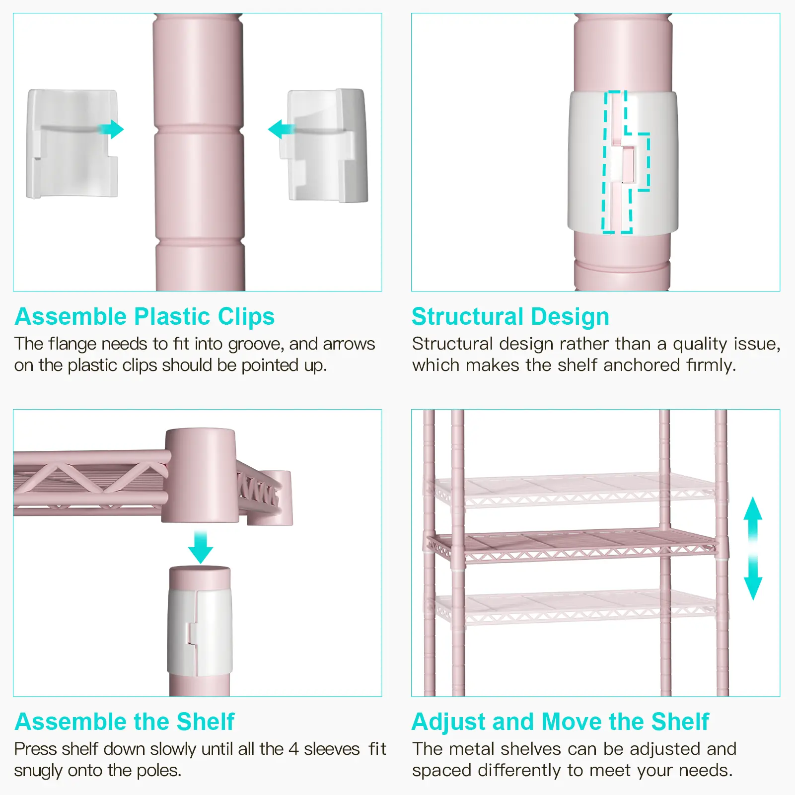 Adjustable & Detachable Design ️ - Assembly: Install plastic clips on the inside flange of the plastic clip and the pole's groove for a snug fit. - Stability: Plastic clips and shelves are adjustable and detachable, offering flexibility in shelf installation positions.