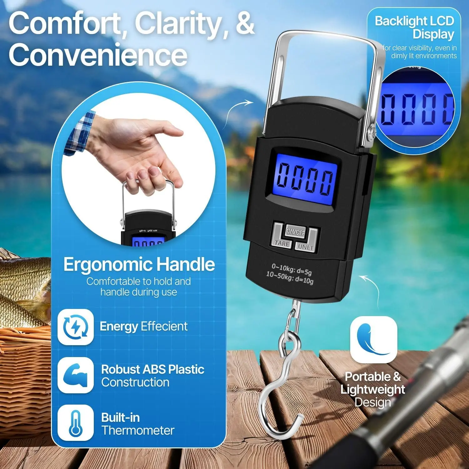 It can be switched between KG/G/OZ/LB and is easy to read when traveling in different countries to meet the needs. Large LCD display with backlight; ABS plastic material and stainless steel hook. N/LB/KG unit conversion function, once you set the unit to pounds for the first time, the memory stays there.