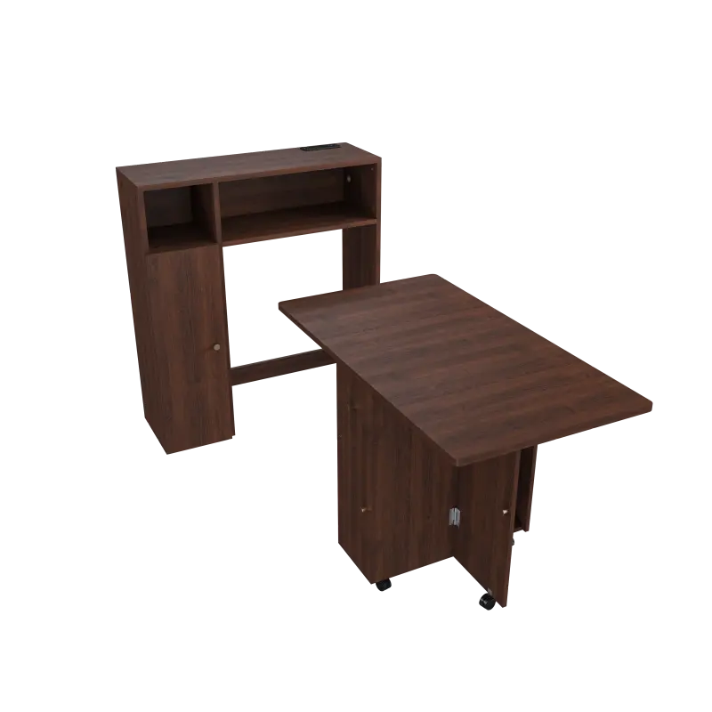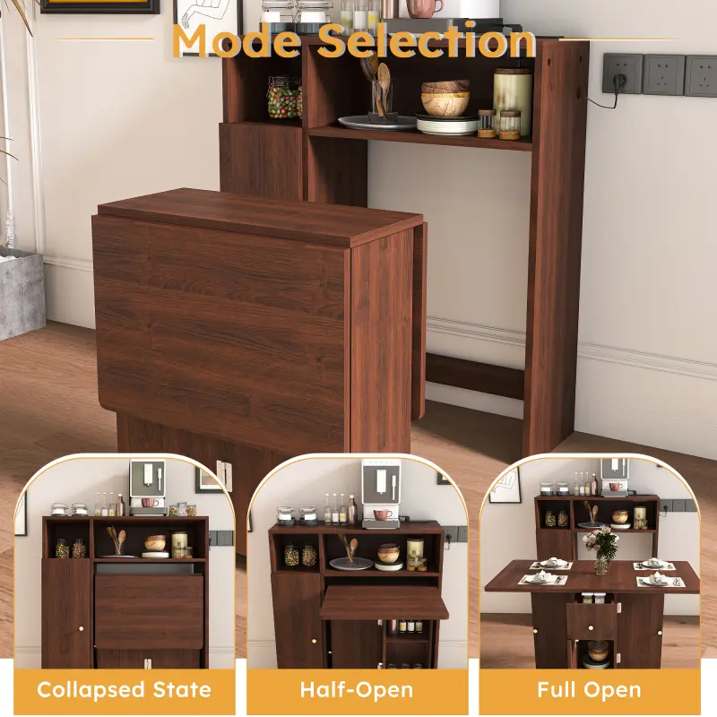 This is a multifunctional, eco-friendly folding dining table designed for small apartments. The product consists of two parts: a sideboard that attaches to the wall, equipped with sockets and cabinets for storing electrical appliances, tableware, and beverages. The dining table can be fully folded and stored underneath the sideboard, maximizing space efficiency. The table can be partially opened or fully extended; partially open, it serves as a temporary dining or working space for two people. Fully extended, it can accommodate 4-6 people for dining. Additionally, the area beneath the table is designed as a storage layer for tableware and other kitchen essentials. This furniture item maximizes space utilization and will bring you great convenience.