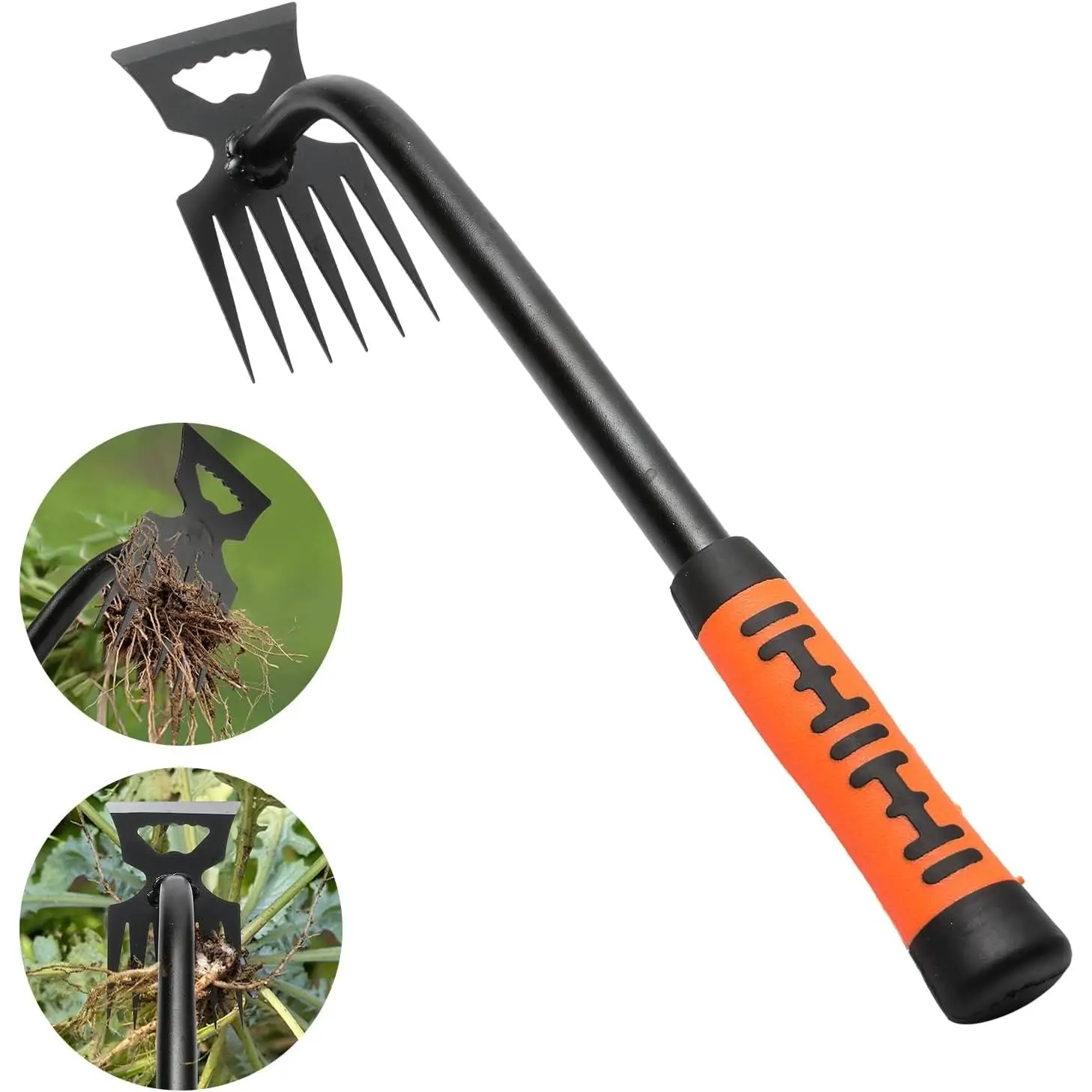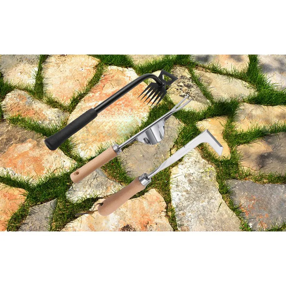 [3 Pcs Gardening Hand Weeder Tools]1* 6 teeth hand weeder tool, 1* L-shape crack weeder, 1* Hand Weeder with lever design.The ergonomically designed hand weeders allow for effortless handlings of everyday gardening tasks such as vegetable planting and landscaping.[Dual-purpose Weed Puller & Cultivator]6 teeth hand weeder with long handle is suitable for weeding, digging, and shoveling.Great for removing weeds of cramped spaces, it also saves labor and time in manually pulling weeds.[L-shape Crack Weeder]Crevice weeding tool for removing stubborn moss and weeds in between pave stones.The sharp blade can easily cleaned off weeds and moss from the stones and helped edge grass line very effectively.[Hand Weeder with Lever Design]Its pointed tip effortlessly navigates narrow spaces, ideal for prying and removing thistles, dandelions, crabgrass, chickweed and other common garden weeds.Works on most soil types especially after a good rain or watering.[Multiple Functions]Our manual multifunctional weeders excel at digging, weeding, loosening soil, aerating, transplanting and more.Ideal for common garden weeds like thistles, dandelions, crabgrass, and chickweed.