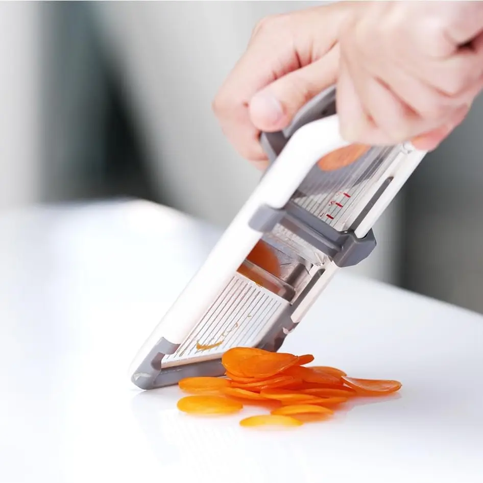 【Adjustable Blade】: Features adjustable stainless steel blades, allowing customization for various slicing thicknesses of fruits and vegetables.