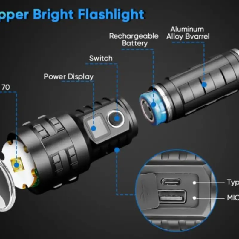 High Lumen Rechargeable Flashlight, Aluminum Alloy, Portable, Three Lighting Modes, Type-C Charging, Smart Display, Camping Essential