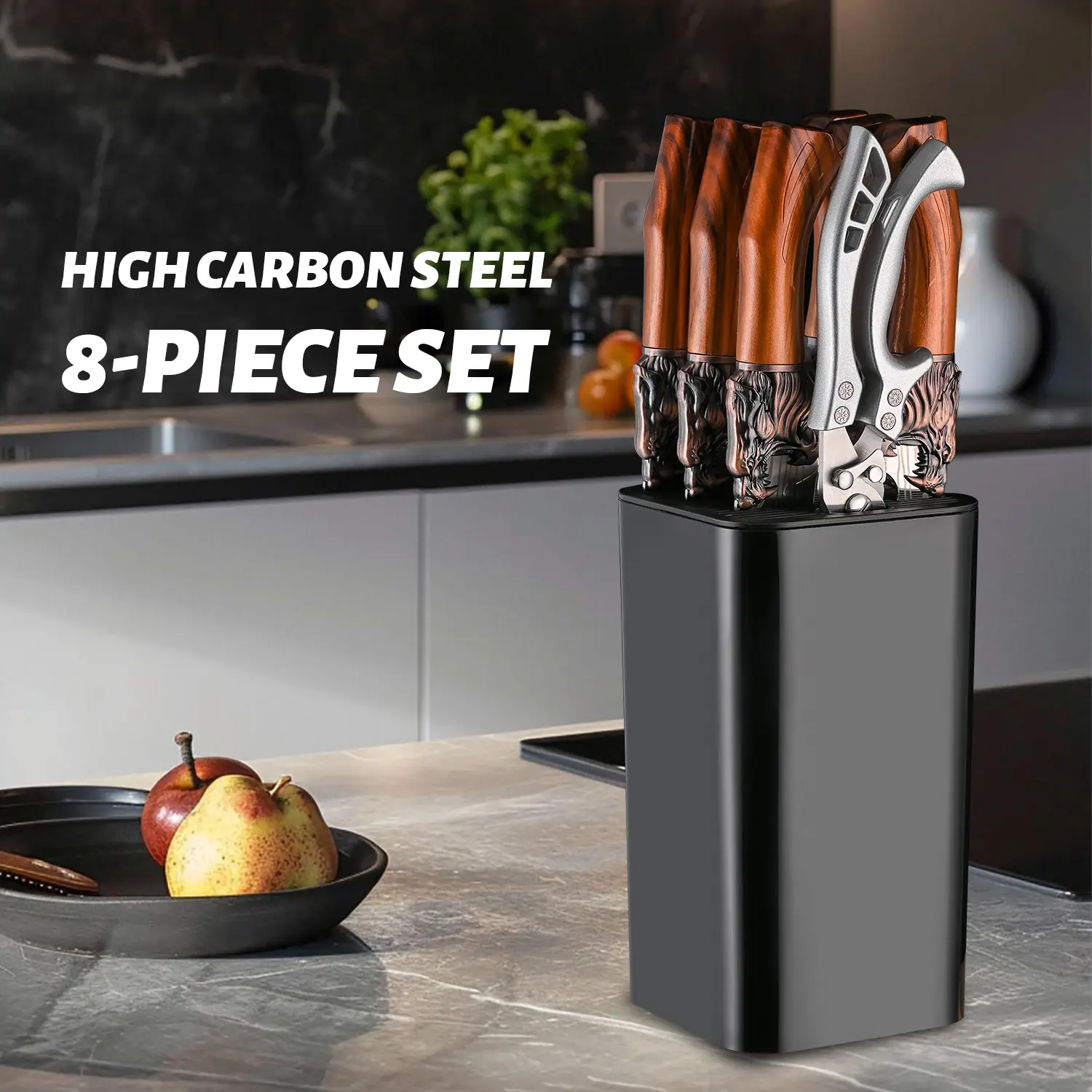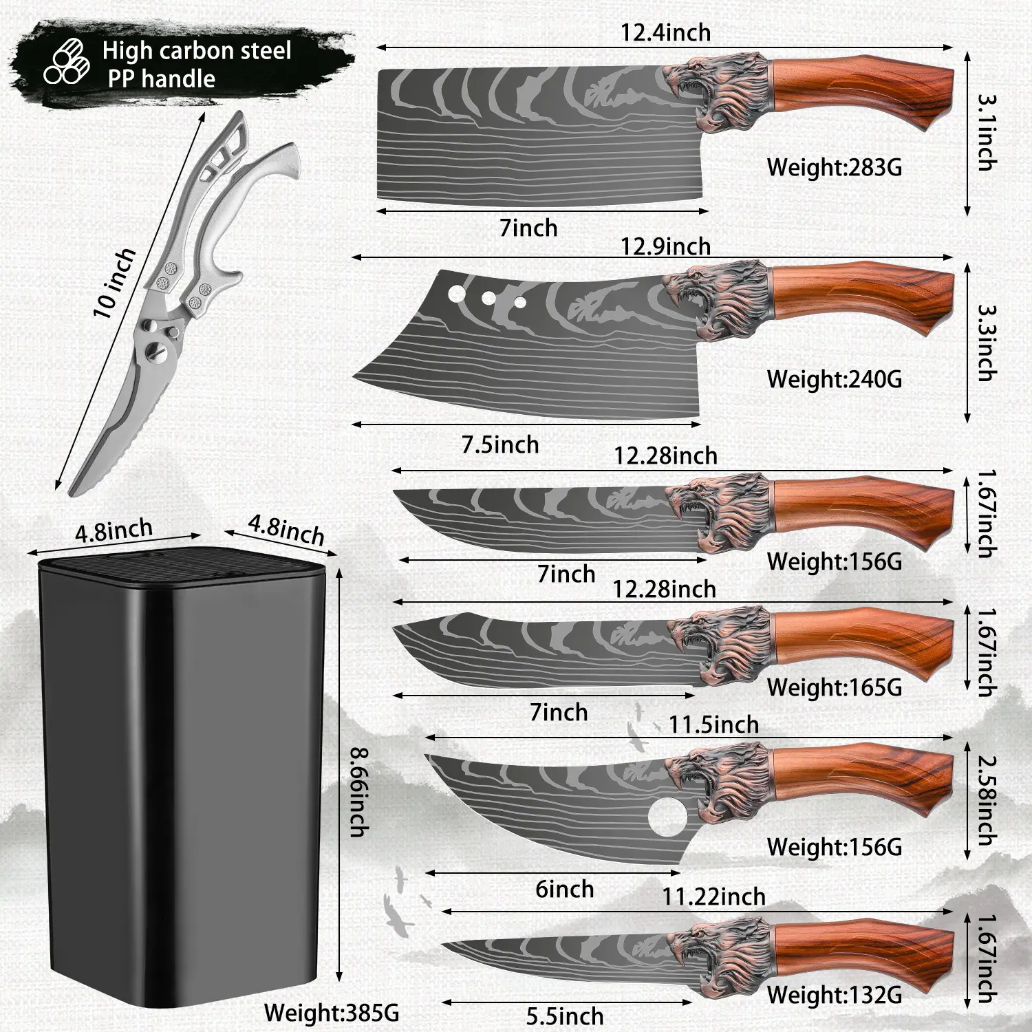 Multifunctional kitchen knife set, 7 different shapes of multi-purpose knives and 1 sharp kitchen scissors, suitable for home kitchen, restaurant back kitchen cutting meat, deboning, cutting sashimi, chopping bones