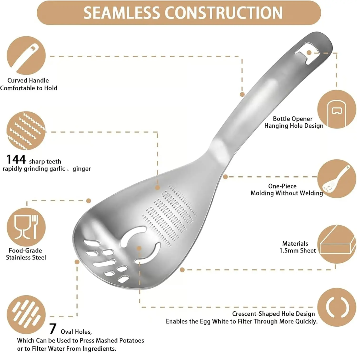 ·Multifunction Cooking Spoon:This multifunction spoon is a kitchen gem. It acts as a potato masher for creamy mash, a pasta spoon for easy serving, and an egg yolk separator. It’s a slotted spoon for draining, has a grater plate for quick grating, and works as a bottle opener.it replaces multiple tools, saving space—essential for efficient cooking.