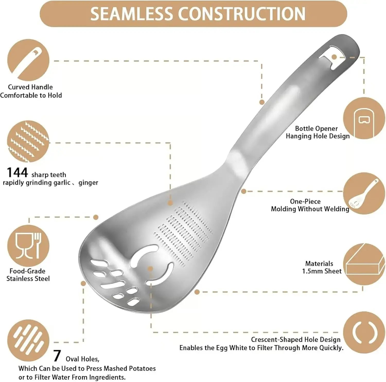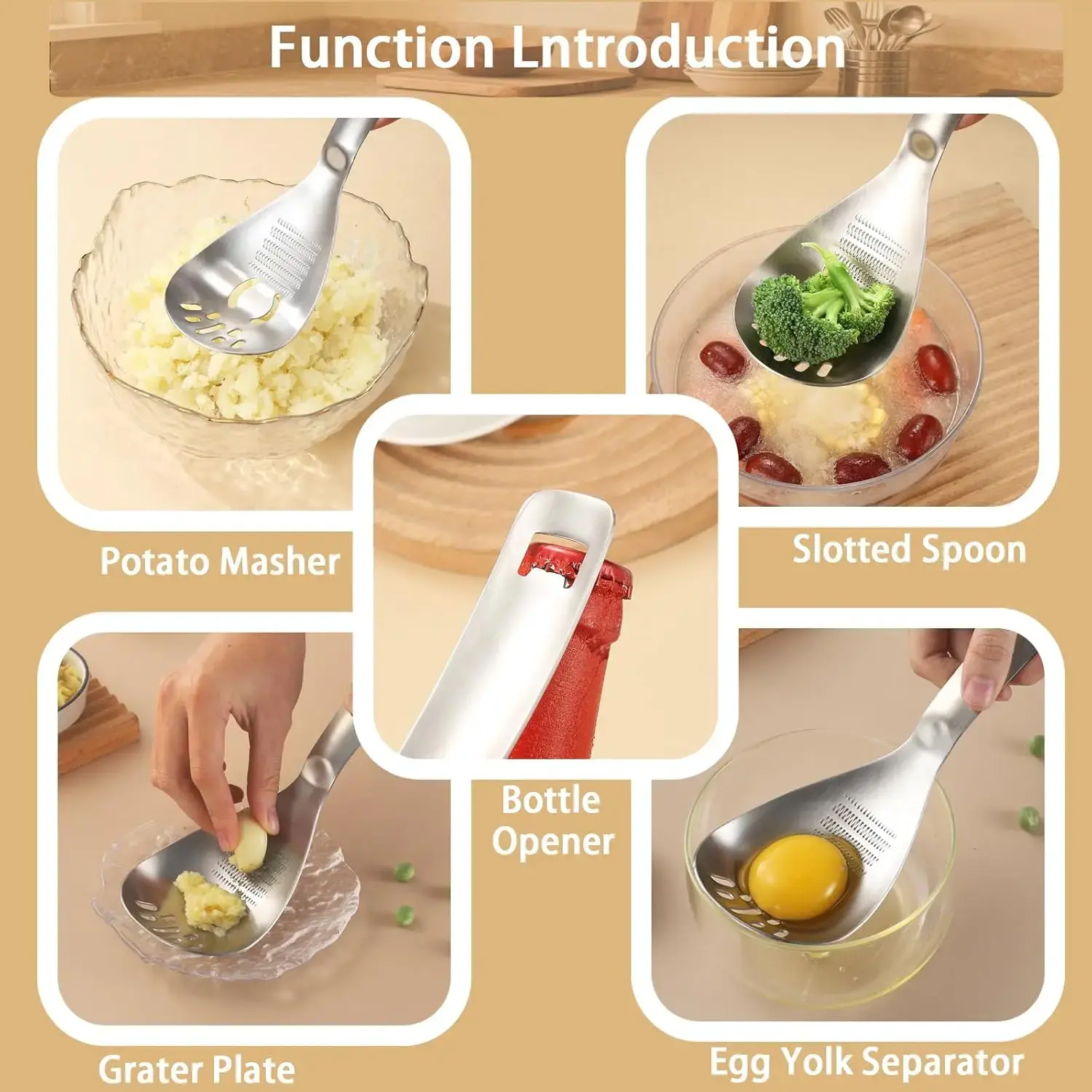 ·Multifunction Cooking Spoon:This multifunction spoon is a kitchen gem. It acts as a potato masher for creamy mash, a pasta spoon for easy serving, and an egg yolk separator. Its a slotted spoon for draining, has a grater plate for quick grating, and works as a bottle opener.it replaces multiple tools, saving space—essential for efficient cooking.