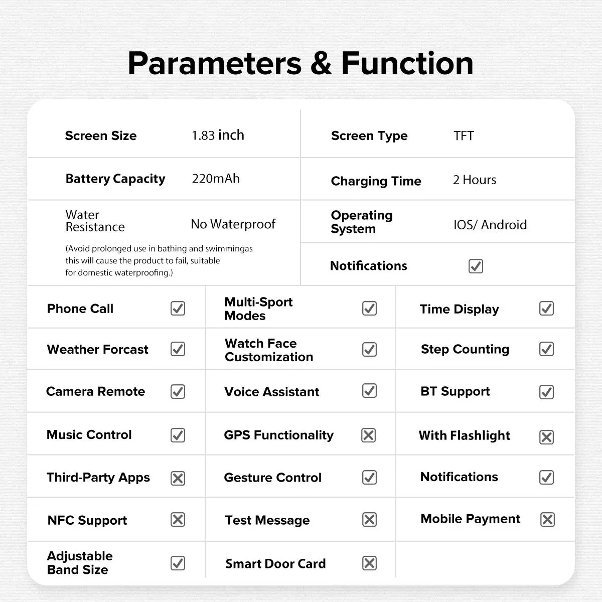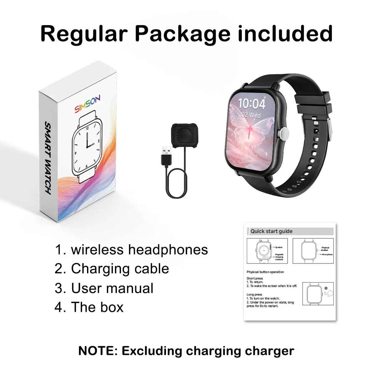 Inside the box, you get the smartwatch with a pre-installed battery (no charger included), ready to sync with your phone app via Bluetooth. Just keep it dry—this watch isn’t waterproof.