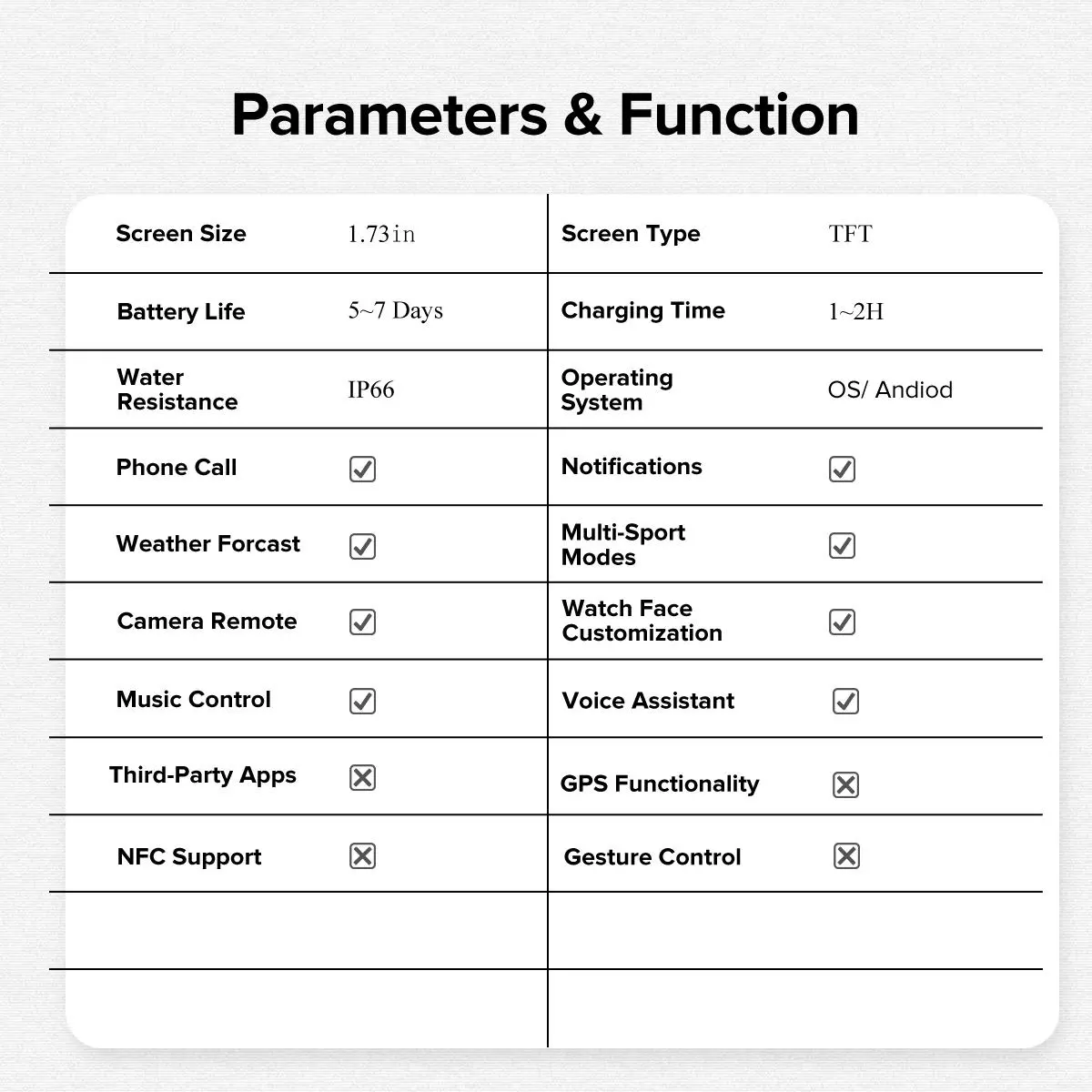 Stay ahead of the weather with real-time forecasts and never miss a beat with notifications for calls, SMS, and apps. The built-in LED flashlight is perfect for those unexpected dark moments, while gesture control adds a fun, futuristic touch. With IP66 water resistance and a battery that lasts up to a week, this watch is ready for your daily hustle.