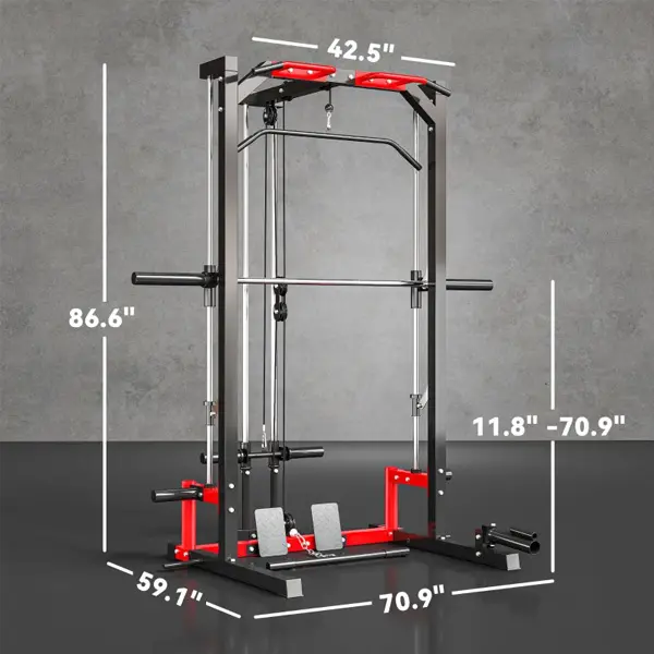 - Spacious and Secure: With overall dimensions of 70.9" L x 59.1" W x 86.6" H and a base width of 47", this power cage with pulley system provides ample space for walk-in workouts