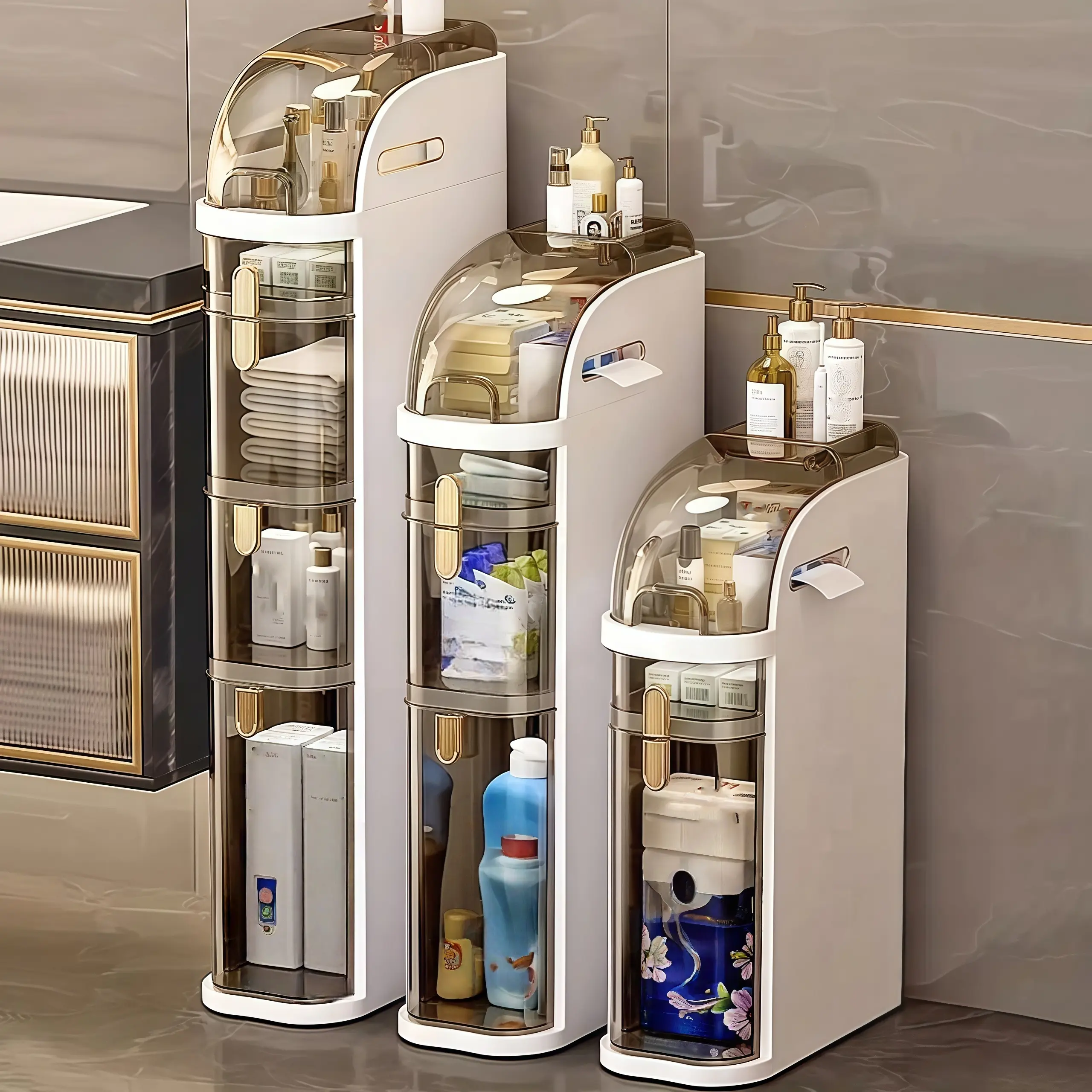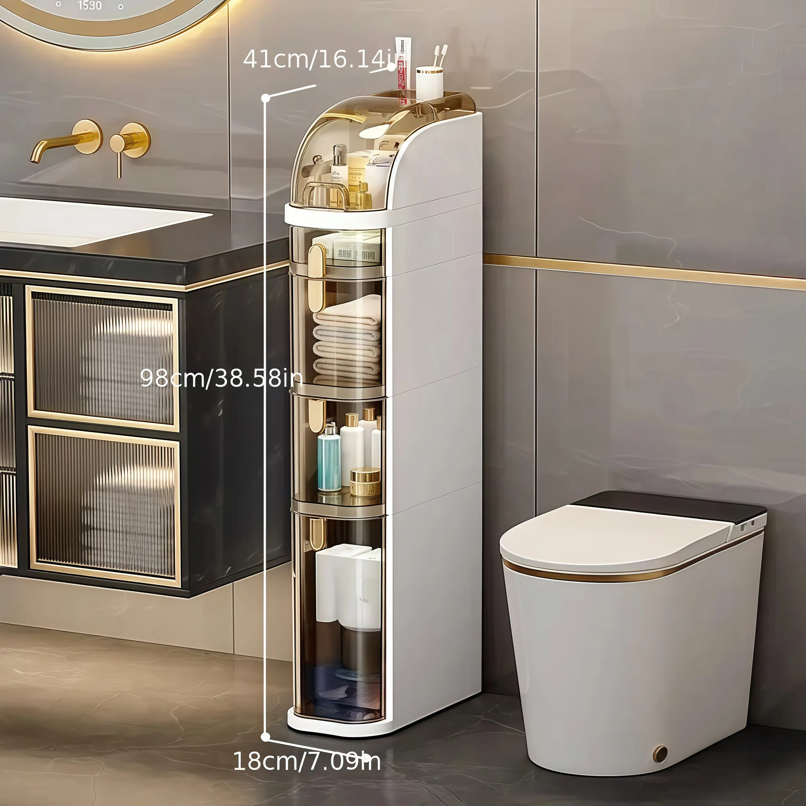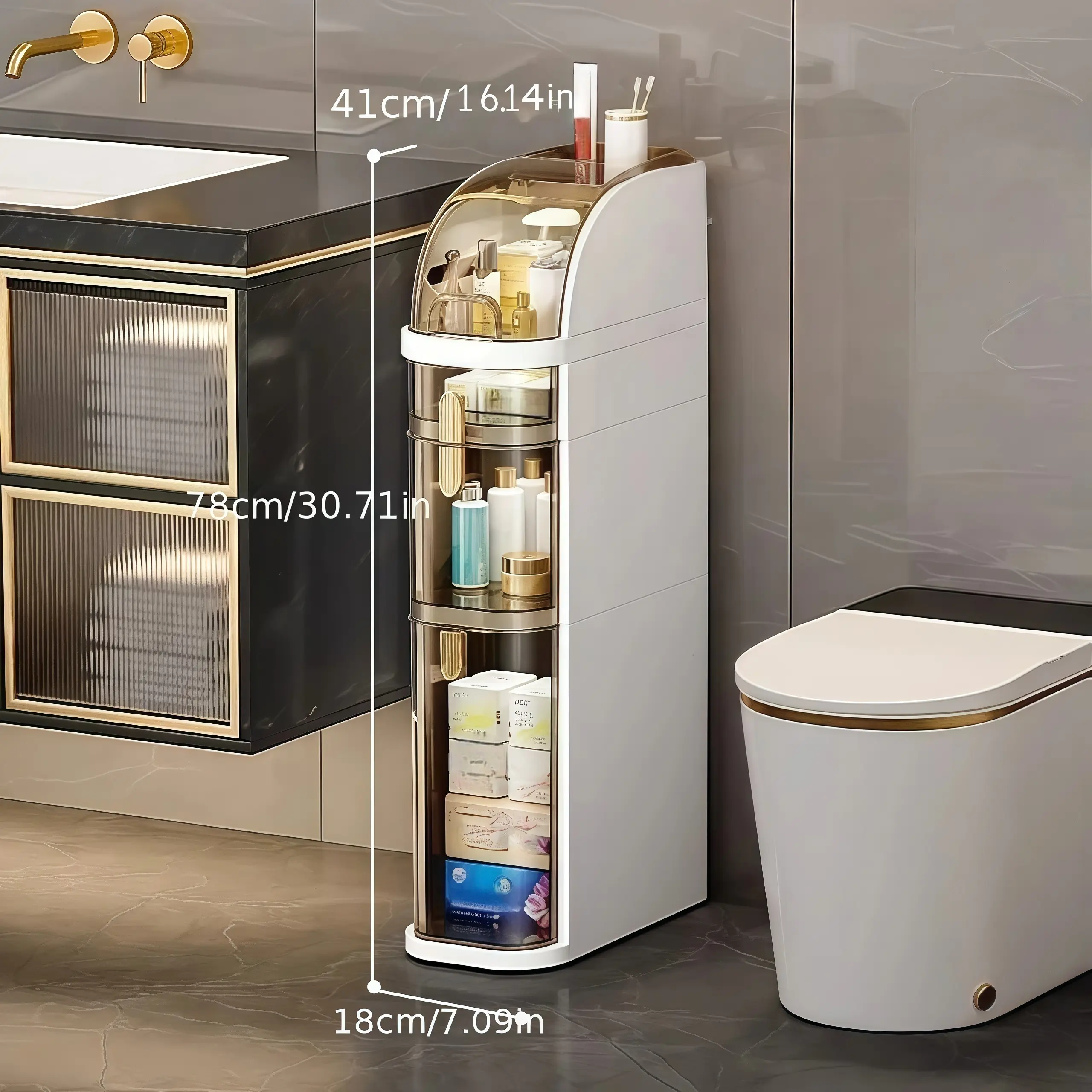My husband was super happy to see all my hair and makeup products go straight into the space saver. We have so much room now on our countertop and it fit nicely between the bathroom counter and toilet.