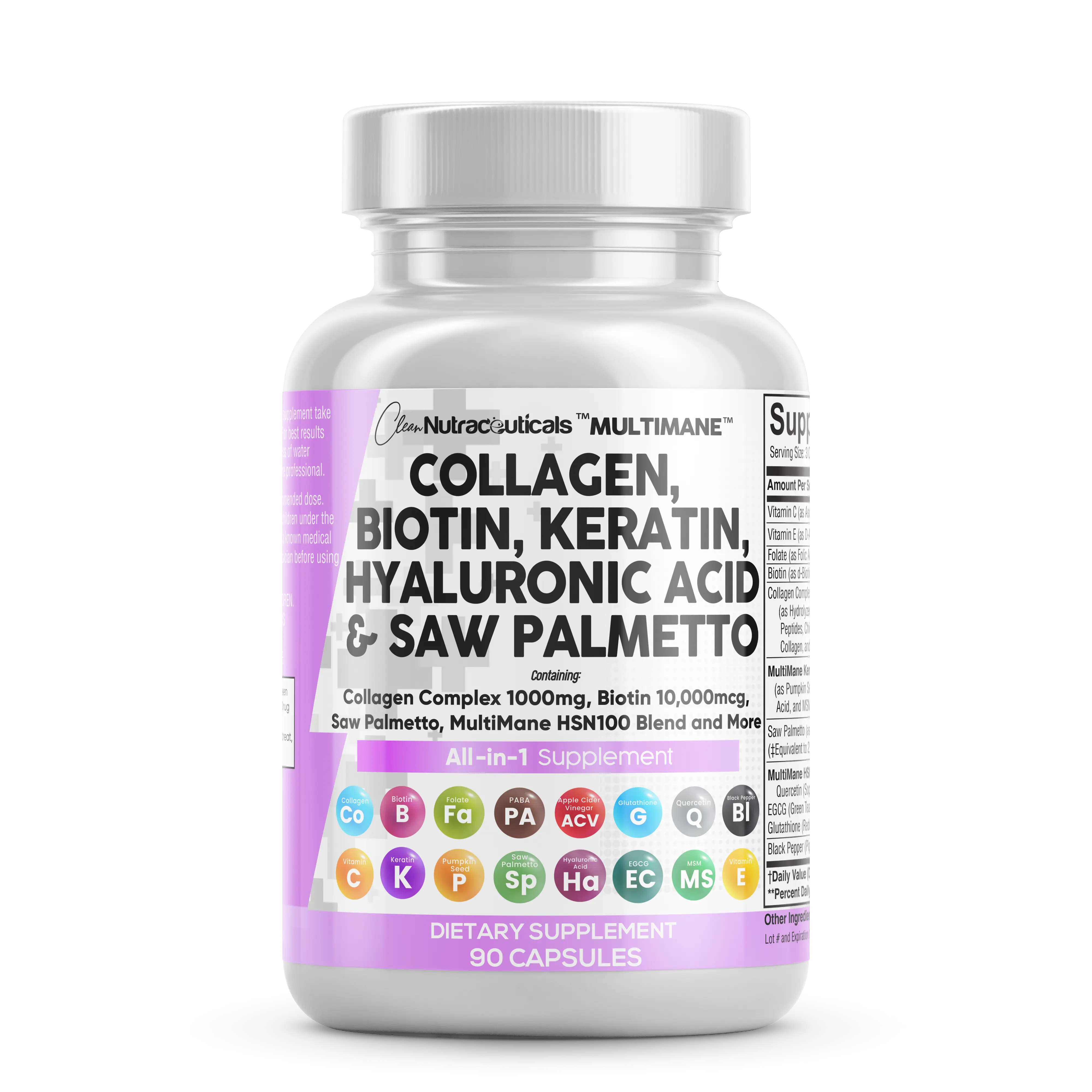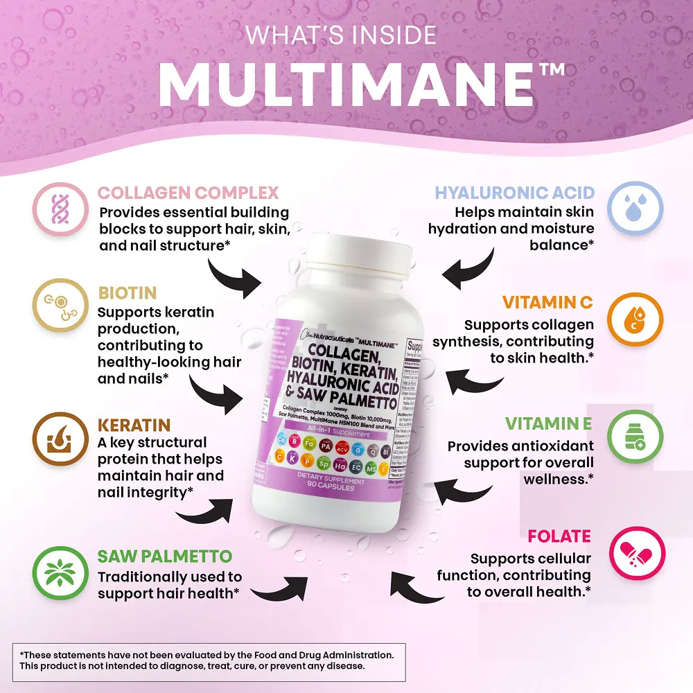MultiMane Collagen Capsules include essential multi-collagen pills (types I, II, III, and IV), biotin vitamins for hair, skin, and nails, keratin treatment, hyaluronic acid supplements, and more.