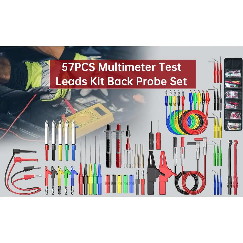 Multimeter test leads with 4mm standard safe banana plugs are made of high quality copper material which have strong conductivity, low resistance and no signal loss.Leads: CAT III 1000V,10A.Length: 3.3ft/1m.Banana to alligator test leads are made of high quality copper material which are soft and flexible.4mm standard banana plugs can fit most multimeters.Copper alligator clips provide stronger conductivity and clamping force.Length: 3.3ft/1m.Rated current: 5A.Wire piercing probes can be easily connected with the 4mm banana plug test leads.Suitable for wire piercing.No need to strip off the cables and no damage to the cables.Textured non-slip design enhances your comfort.High reliability and long service life.57PCS multimeter test leads back probe kit can be used not only for electrical testing, automotive diagnostics, testing and repairing, but also in physics laboratories, schools, homes and industries.Replaceable probes, banana plugs, alligator clips, wire piercing probes and test hook clips can help expand testing capability and flexibility.List: 5PCS banana to alligator test leads, 2PCS multimeter leads, 8PCS replaceable probes set, 2PCS inner spring short needles, 2PCS banana to test hook wires, 15PCS back probes set, 5PCS insulated alligator clips to banana male, 5PCS banana female to female connector, 5PCS piercing probes with sheath, 5PCS lengthened wire piercing probes, 2PCS 4mm male to 2mm female adapters, 2PCS heavy duty alligator clamps, 2PCS insulation piercing probes, A six accommodating position folded package.