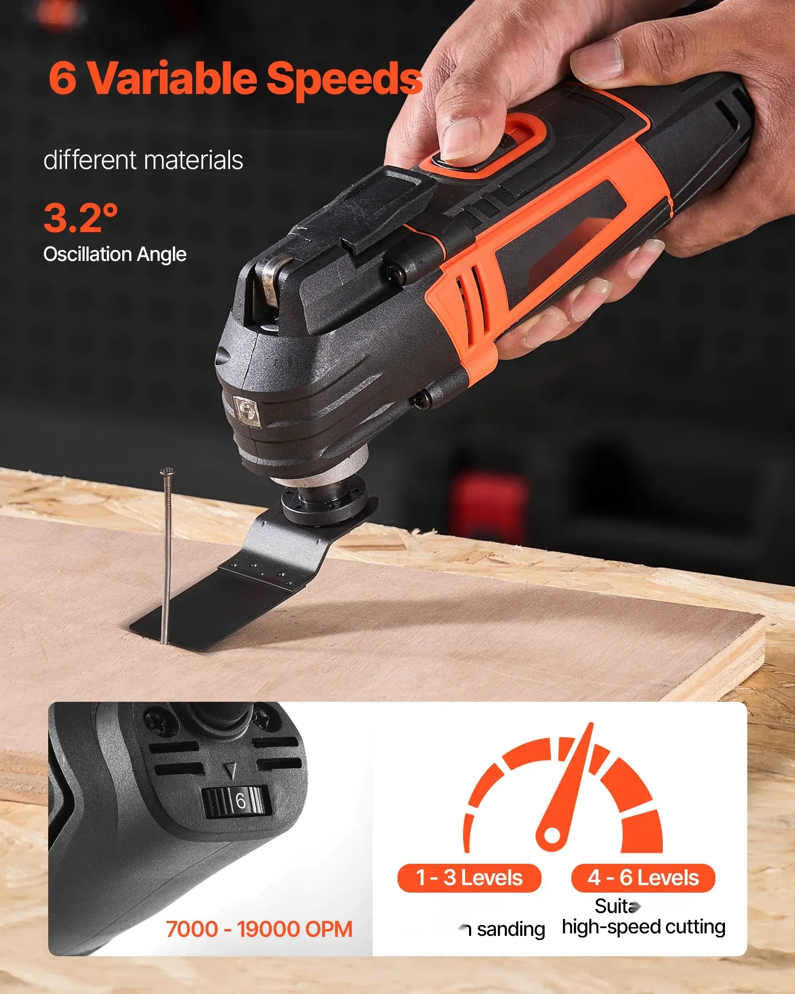 ·6 Variable Speeds: This multitool oscillating tool features a 3.2° oscillation angle and 6-speed settings (7000 - 19,000 OPM) to adapt to different tasks. Use levels 1â3 for precision sanding, and levels 4â6 for fast, high-efficiency cutting