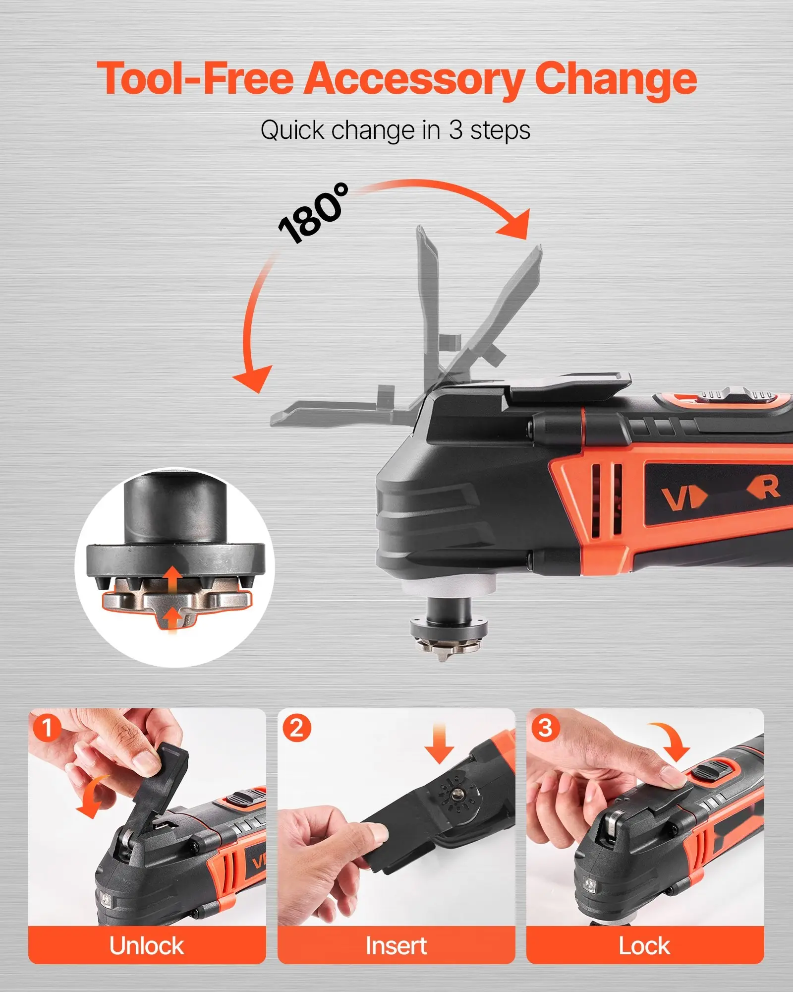 4Amps corded multitool oscillating tool comes with a variety of saw accessories to handle sanding, cutting, scraping and more tasks easily. It features 6 speeds from 7,000 to 19,000 OPM, a quick blade change design, LED work light - ideal for home improvement, woodworking, and DIY projects.