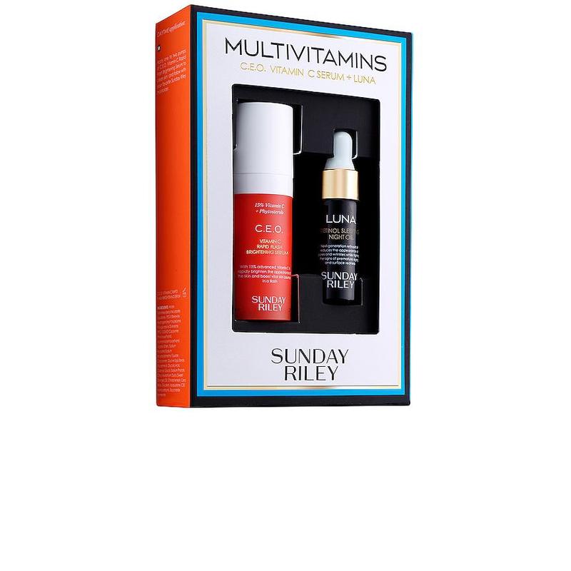 ·ingredients: C.E.O. Rapid Flash Brightening Serum: Water, Tetrahexyldecyl Ascorbate, Squalane, PEG-8 Beeswax, Hydrogenated Polydecene, Polyglyceryl-6 Distearate, PPG-12/SMDI Copolymer, Phenoxyethanol, Acetamidoethoxyethanol, Jojoba Esters, Sodium Acrylate/Sodium Acryloyldimethyl Taurate Copolymer, Glycine Soja Sterols, Tocopherol, Glycolic Acid, Caprylyl Glycol, Sodium Phytate, Citrus Aurantium Dulcis (Sweet Orange) Oil, Chlorphenesin, Cera Alba, Glycerin, Isosqualane, C30 Hydrocarbons, Saccharide Isomerate.Luna Sleeping Night OIl: Persea Gratissima (Extra Virgin, Cold Pressed Avocado) Oil, Vitis Vinifera (Organic, Cold Pressed Concord Grape) Seed Oil, Rubus Fruticosus (Cold Pressed Blackberry) Seed Oil, Salvia Hispanica (Cold Pressed Chia) Oil, Dimethyl Isosorbide (and) Hydroxypinacolone Retinoate, Chamomilla Recutita (Matricaria) Flower Oil, Tanecetum annuum (Blue Tansy) Oil, Anthemis nobilis (English Chamomile) Oil, Eriocephalus punctulatus (Cape Chamomile) Oil, Citrus Aurantium Amara (Neroli) Oil, Citrus Aurantium Dulcis (Blood Orange) Oil, Cananga Odorata Flower (Ylang Ylang) Oil, Vetivera zizanoides (Vetiver) Oil, Helianthus Annuus (Sunflower) Seed Oil (and) Rosmarinus officinalis (Rosemary) Leaf Extract, CI 61565 (Green 6), CI 60725 (Violet 2). Disclaimer: Ingredients are subject to change at the manufacturer's discretion. For the most complete and up-to-date list of ingredients, refer to the product packaging.