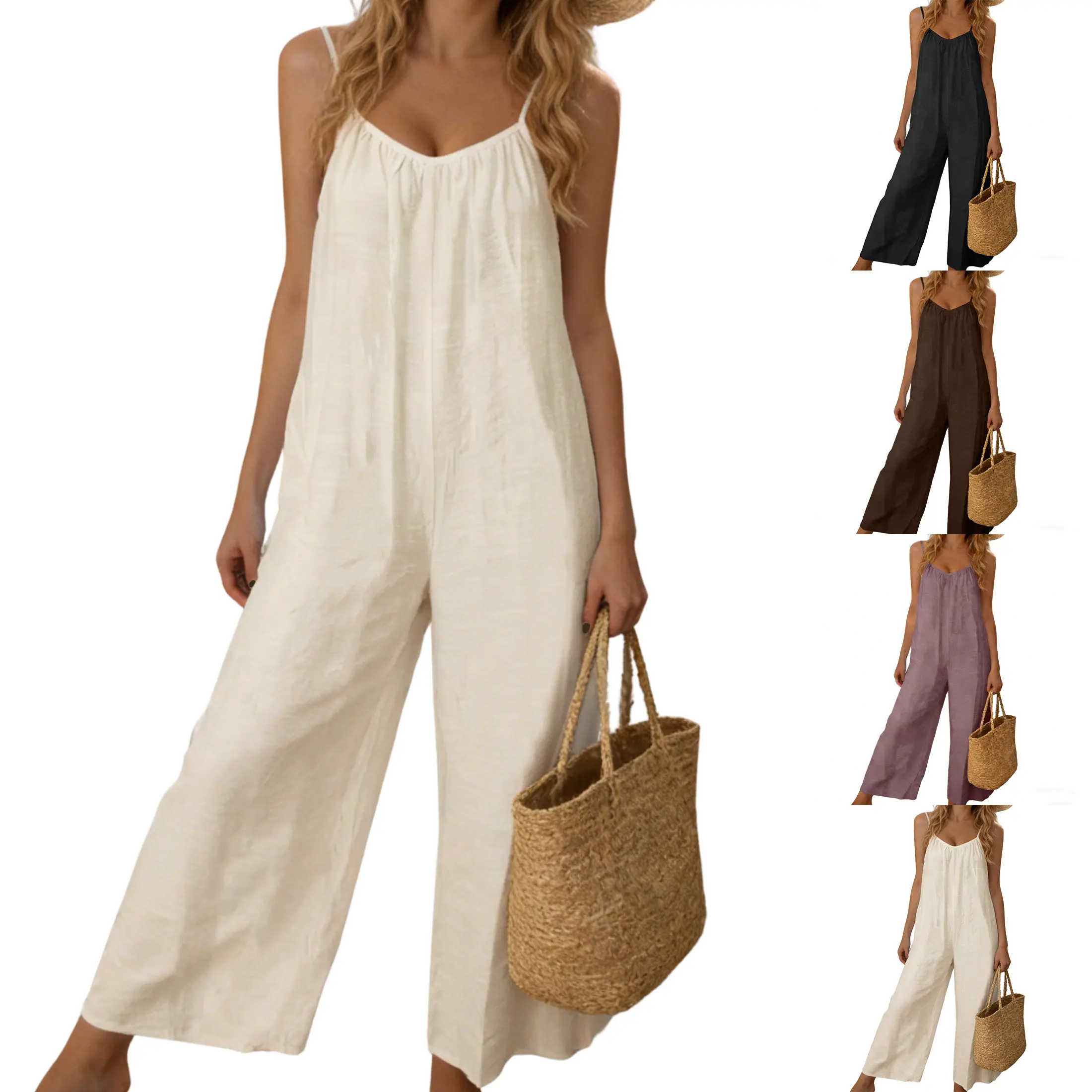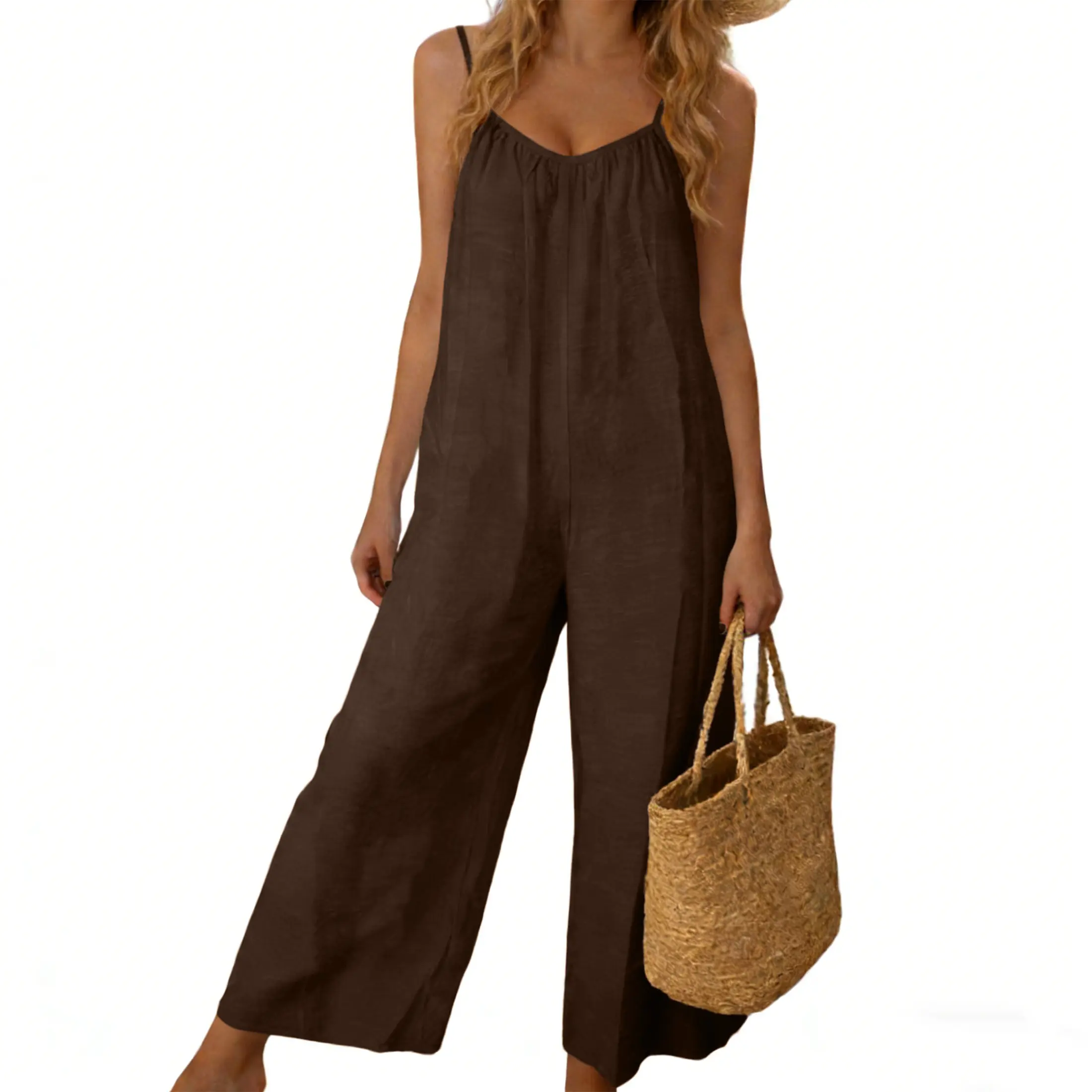 Feature: One Piece Sleeveless Jumpsuits, Two Side Pockets, Solid Color, Stretchable Long Pants Jumpsuit, Adjustable Spaghetti Strap, Loose Fit, Casual Style.