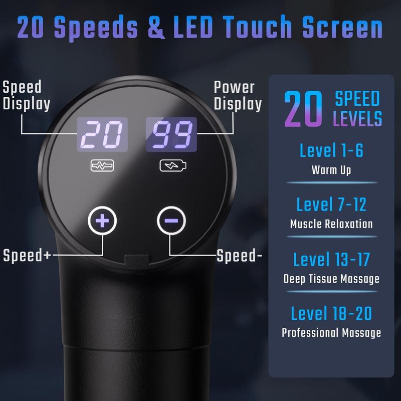 This massage gun is spectacular it has a level 1 from 20 and I usually use level 20 and so far it’s been really good it charges fast and comes with lots of attachments Also come with a charger