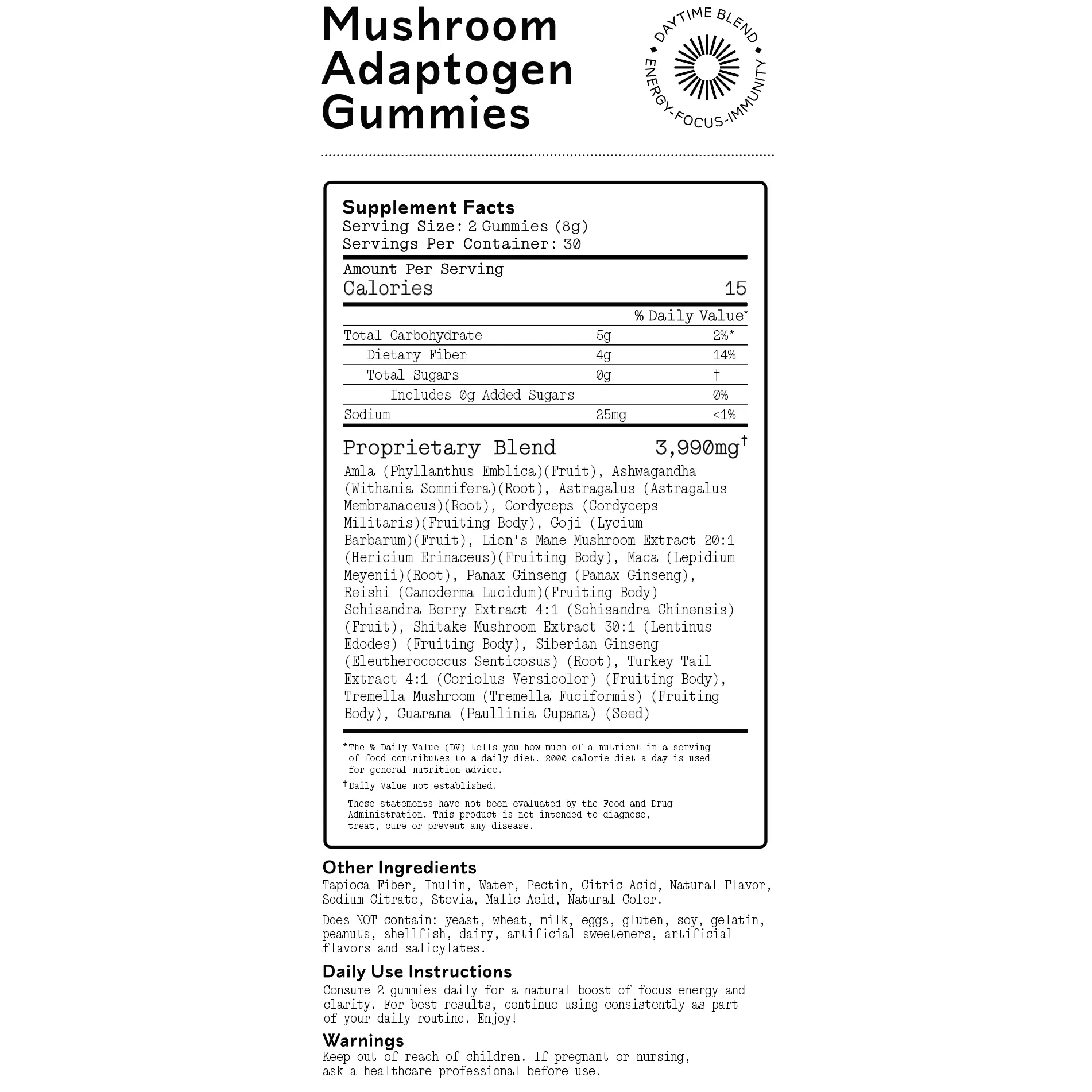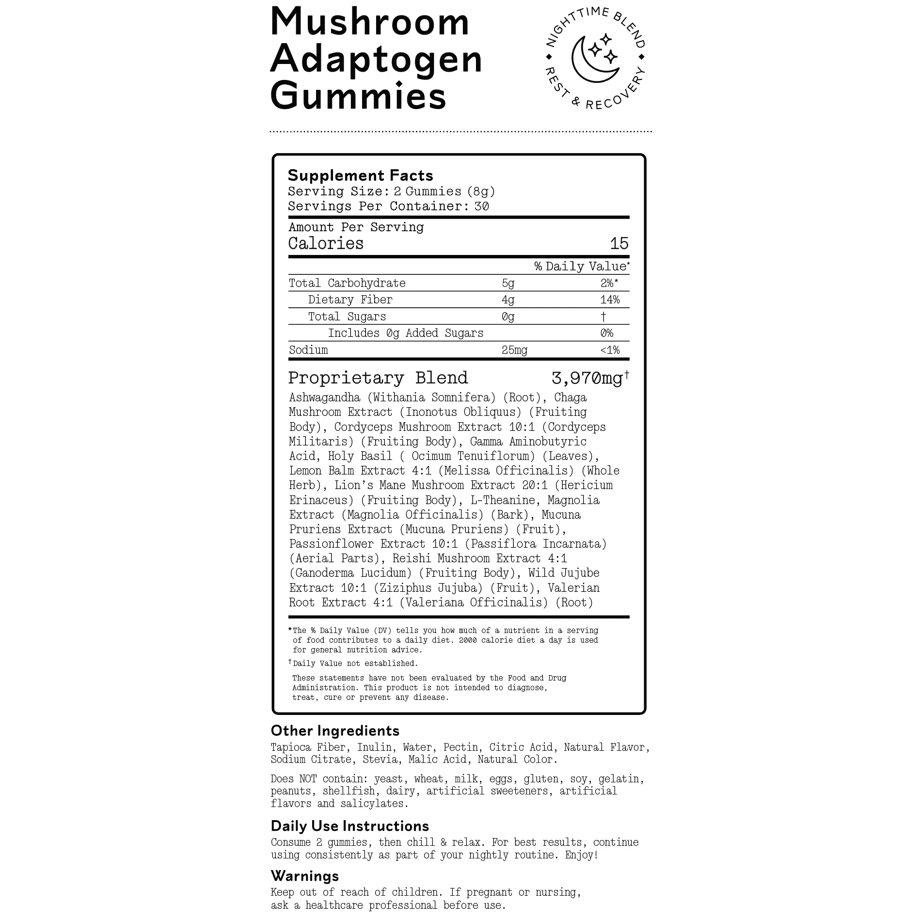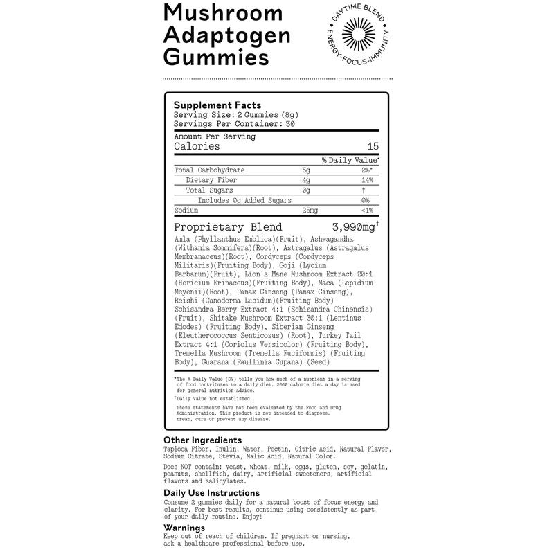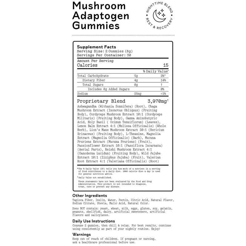 IngredientsAshwagandha (Withania Somnifera) (Root), Chaga Mushroom Extract (Inonotus Obliquus) (Fruiting Body), Cordyceps Mushroom Extract 10:1 (Cordyceps Militaris) (Fruiting Body), Gamma Aminobutyric Acid, Holy Basil (Ocimum Tenuiflorum) (Leaves), Lemon Balm Extract 10:1 (Melissa Officinalis) (Whole Herb), Organic Lion's Mane Mushroom Extract 20:1 (Hericium Erinaceus) (Fruiting Body), L-Theanine, Magnolia Extract (Magnolia Officinalis) (Bark), Mucuna Pruriens Extract (Mucuna Pruriens) (Fruit), Passionflower Extract 4:1 (Passiflora Incarnata) (Aerial Parts), Reishi Mushroom Extract (Ganoderma Lucidum) (Fruiting Body), Wild Jujube Extract 10:1 (Ziziphus Jujuba) (Fruit), Valerian Root (Valeriana Officinalis) (Root), Tapioca Syrup, Purified Water, Allulose, Pectin, Natural Flavors, Maltodextrin, Dextrin, Citric Acid, Natural Color (Red Radish Juice Extract), Natural Blue Food Color (Butterfly Pea Extract)