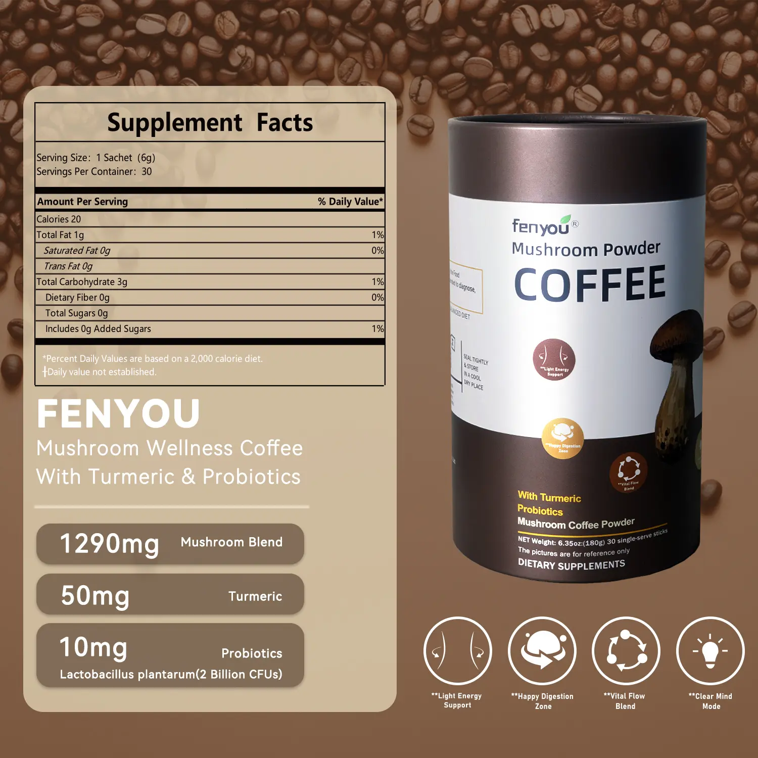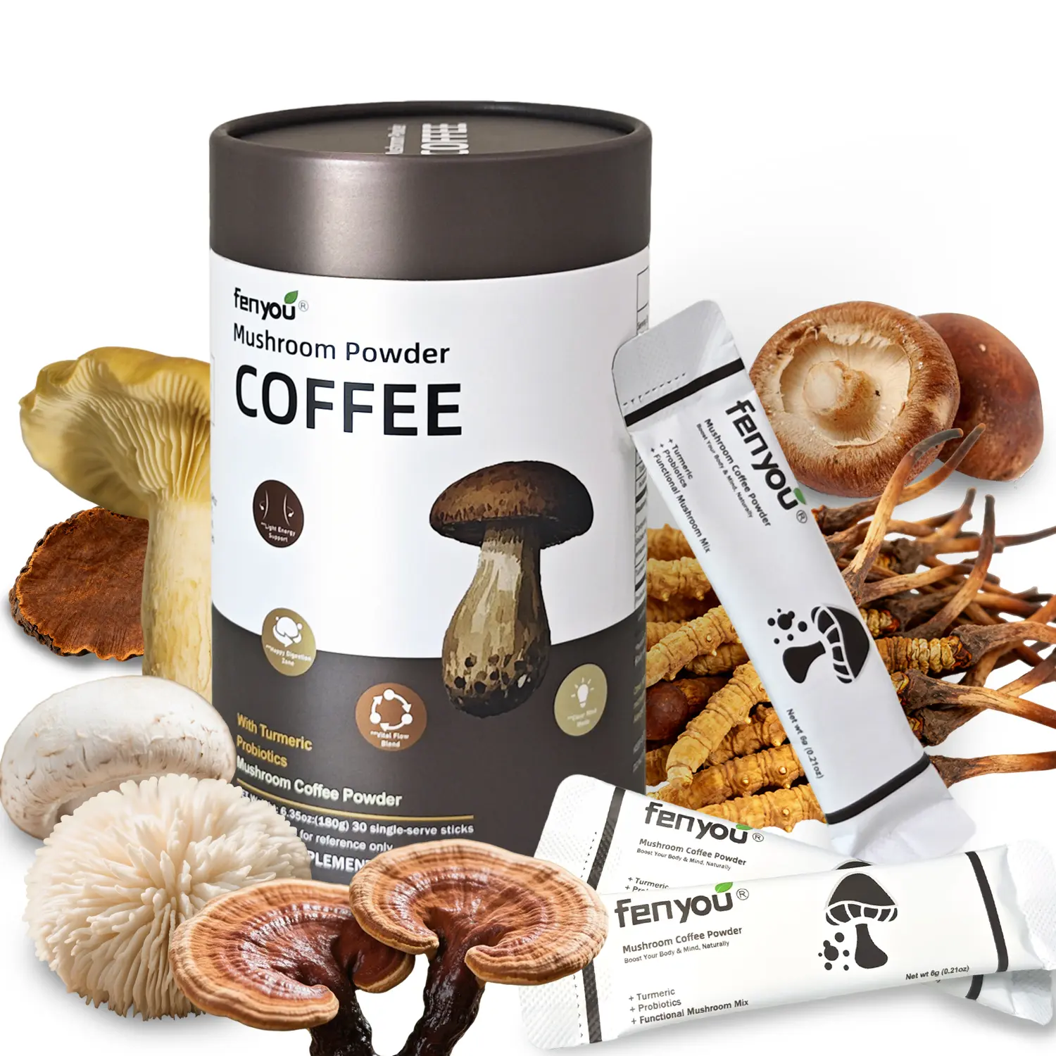 180g with 30 individual packs redefines instant mushroom coffee. Shelf-stable and travel-friendly, it's the ultimate functional coffee solution. Perfect for on-the-go use and convenient storage.