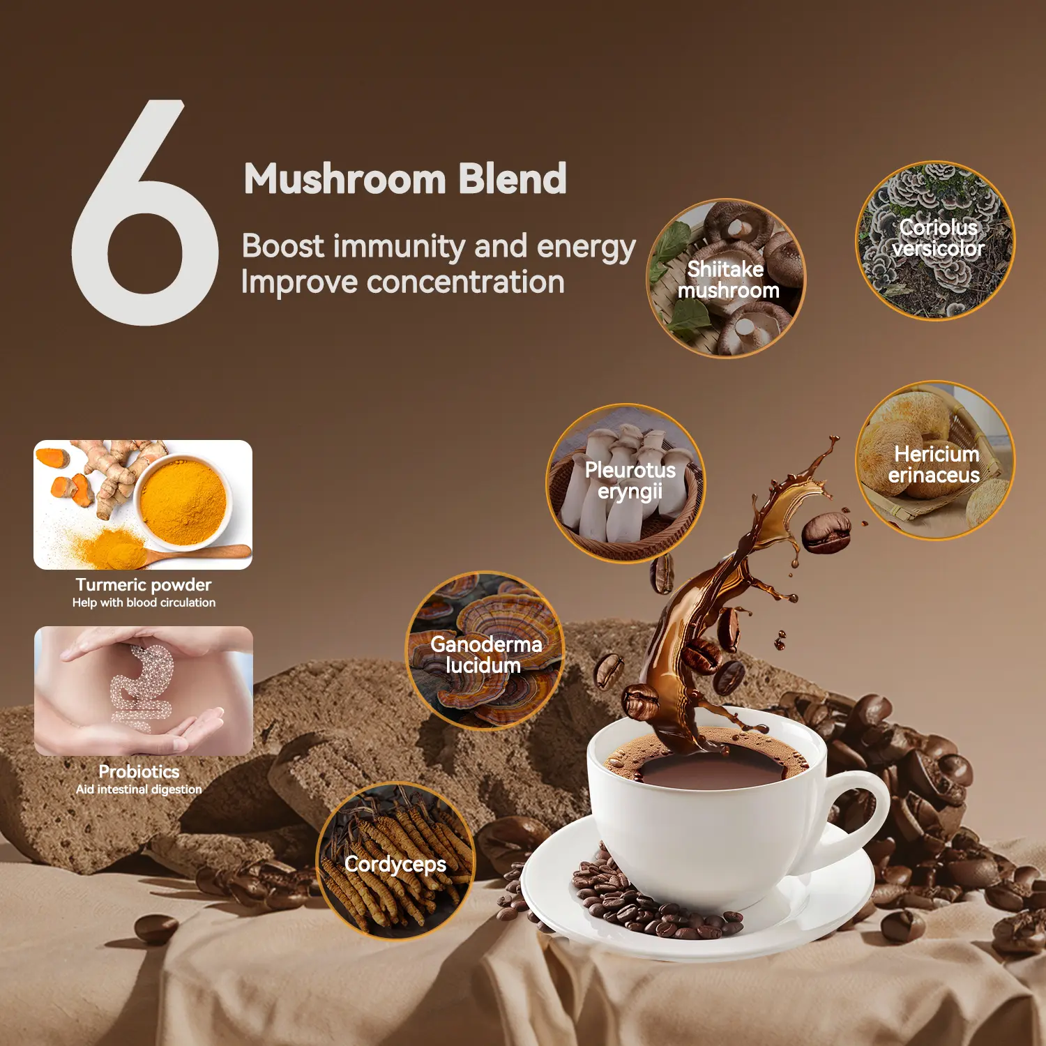 Coriolus versicolor and Turmeric work synergistically for circulation. As an instant coffee, it delivers Flow Support benefits without preparation hassle. Enjoy improved circulation with every sip.