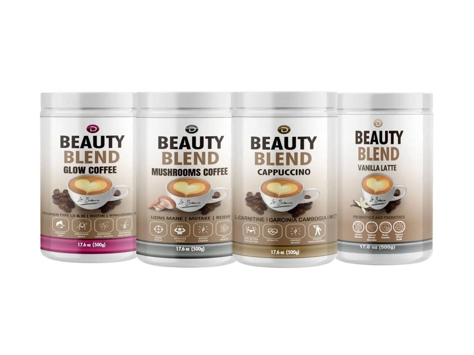 Enjoy four unique blends in one convenient bundle. Each 17.6 oz (500 g) mix delivers premium Arabica coffee, targeted nutrients, and indulgent flavor. Support focus, metabolism, gut balance, and beauty with every cup. Perfect for a daily wellness routine.