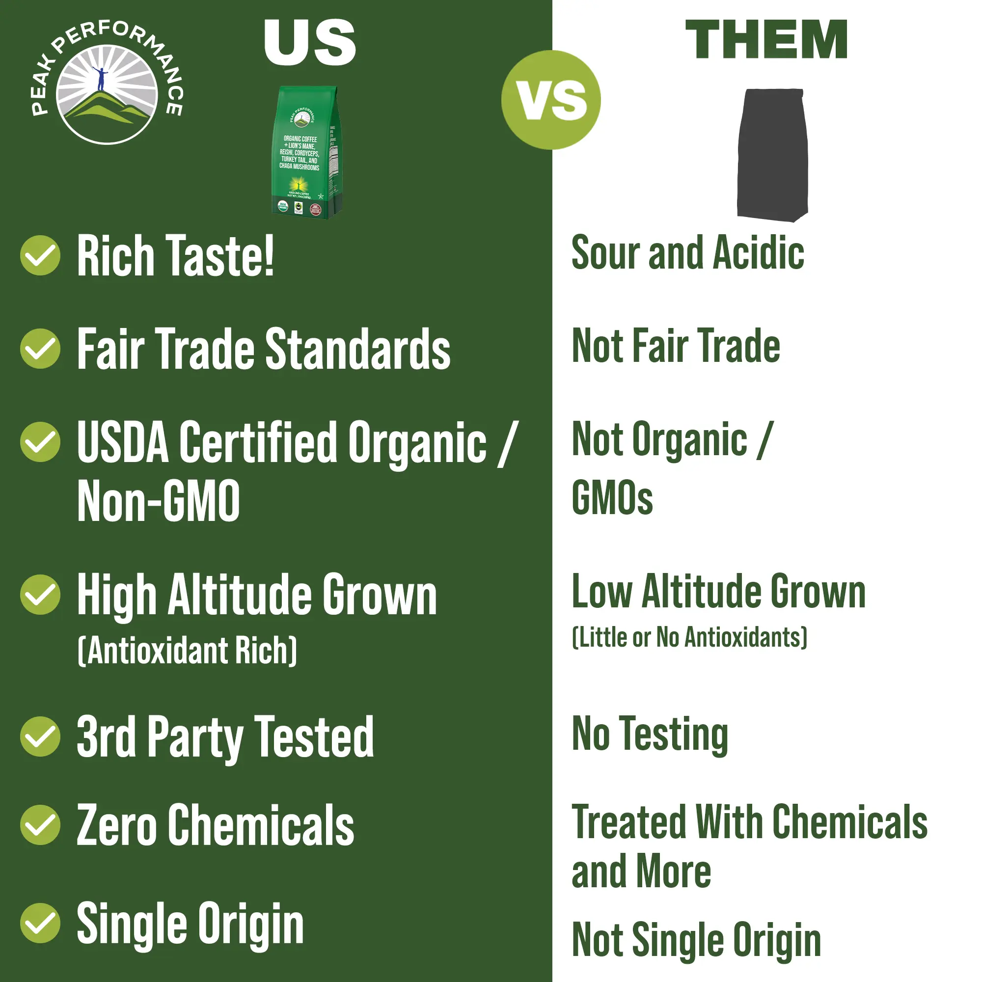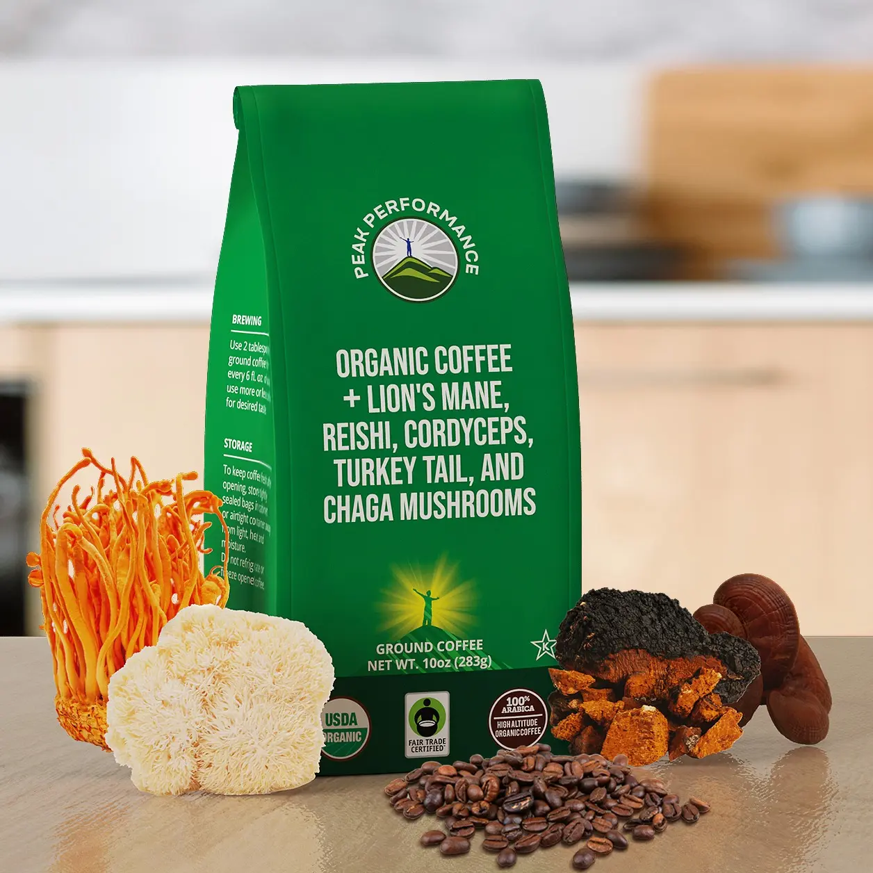·This is NOT some cheap instant Mushroom Coffee that tastes awful. With Peak Performance you get a GREAT Tasting Fair Trade - Low Acid - USDA Certified Organic - Single Origin - High Altitude Guatemalan Coffee carefully infused with Lion's Mane, Reishi, Cordyceps, Turkey Tail, Chaga Mushrooms for immune support, energy, performance, and brain boost without the jitters.