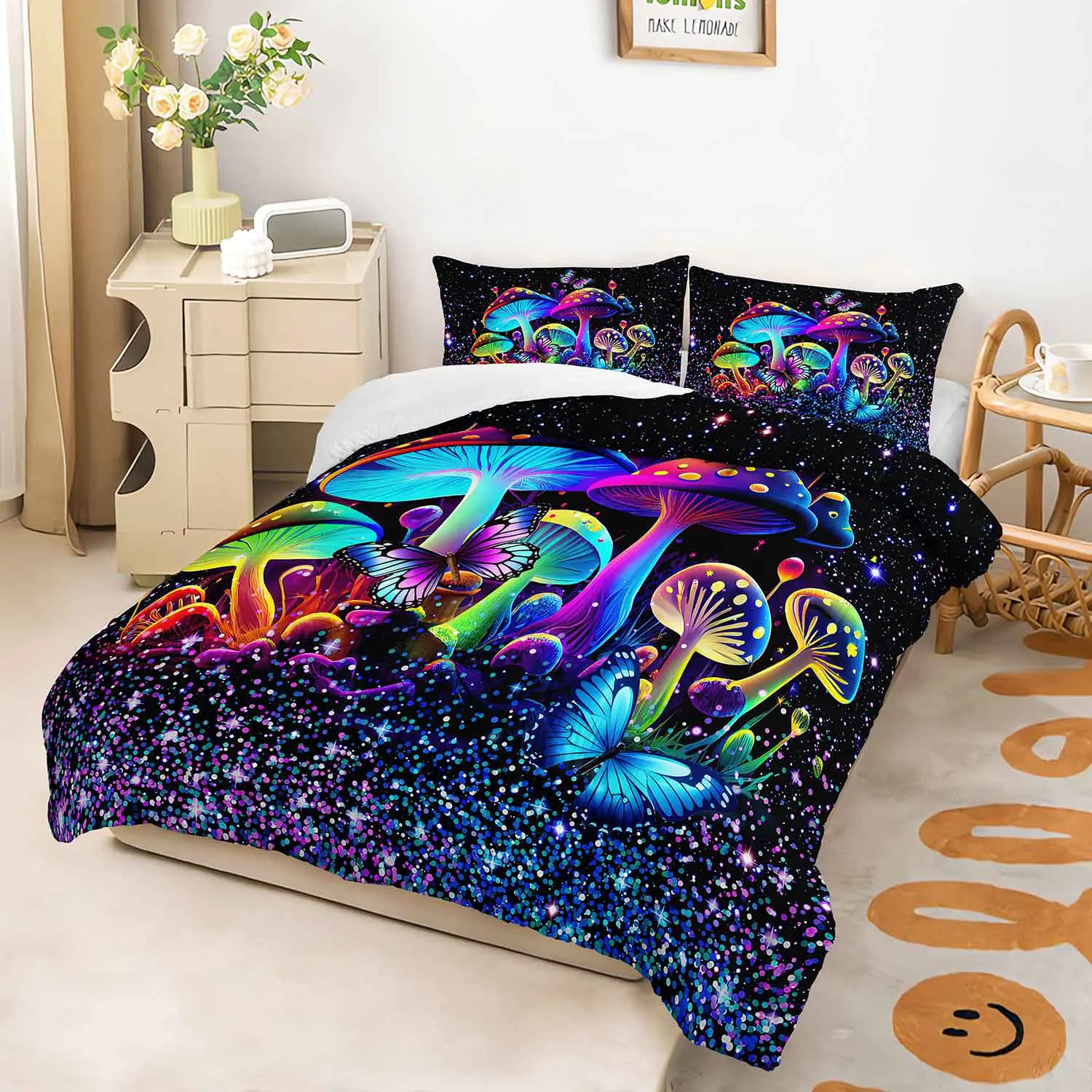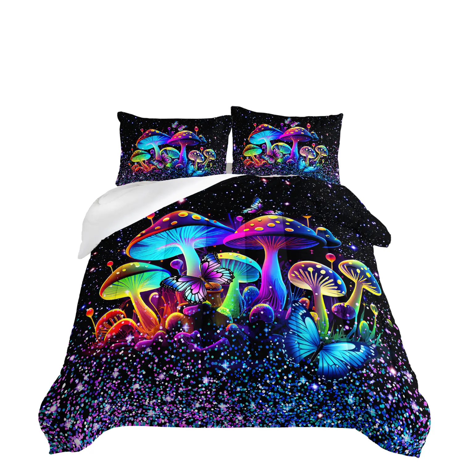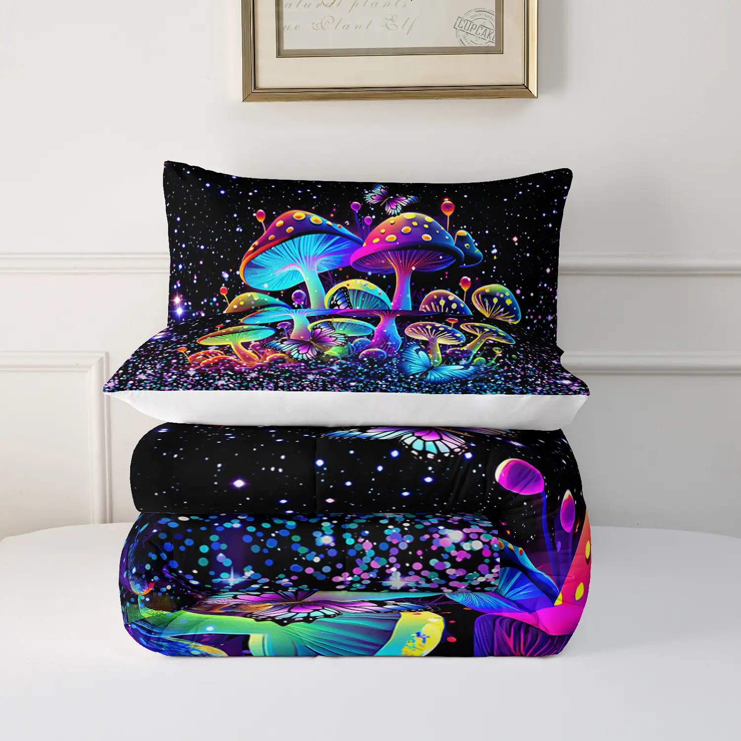 3pcs Mushroom Comforter Set, Fantasy Duvet Set for Girls and Adults Bedroom or Guest Room Decor, Lightweight Soft All Seasons Comforter Machine Washable Microfiber Quilt with 2 Pillowcases, Gifts for the Family