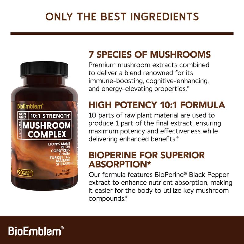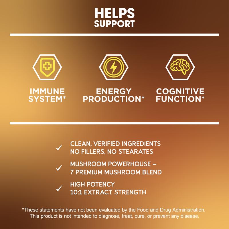 7 Mushroom Blend for Brain Function: Our premium supplement combines 7 powerful mushrooms (Turkey Tail, Shiitake, Reishi, Maitake, Lion's Mane, Cordyceps, Chaga), concentrated 10:1 for immune support, cognitive enhancement, and energy production.