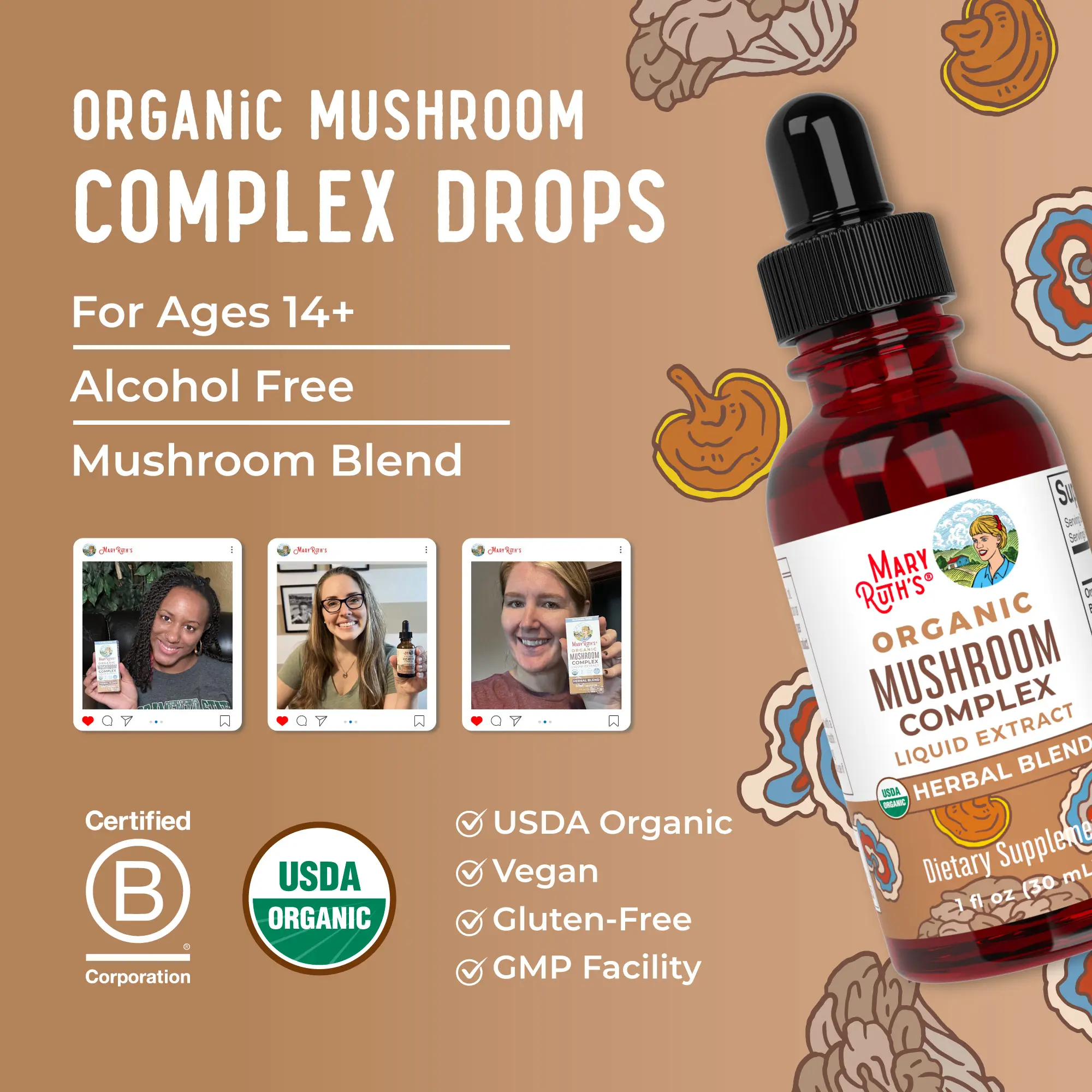 For Most Lifestyles: MaryRuth's Mushroom Complex Herbal Blend is USDA Organic, Non-GMO, Vegan, Made in a GMP Facility. Dairy free, nut free, gluten free, soy free, sugar free, no synthetic or artificial colors, alcohol free tincture. B Corp Certified.