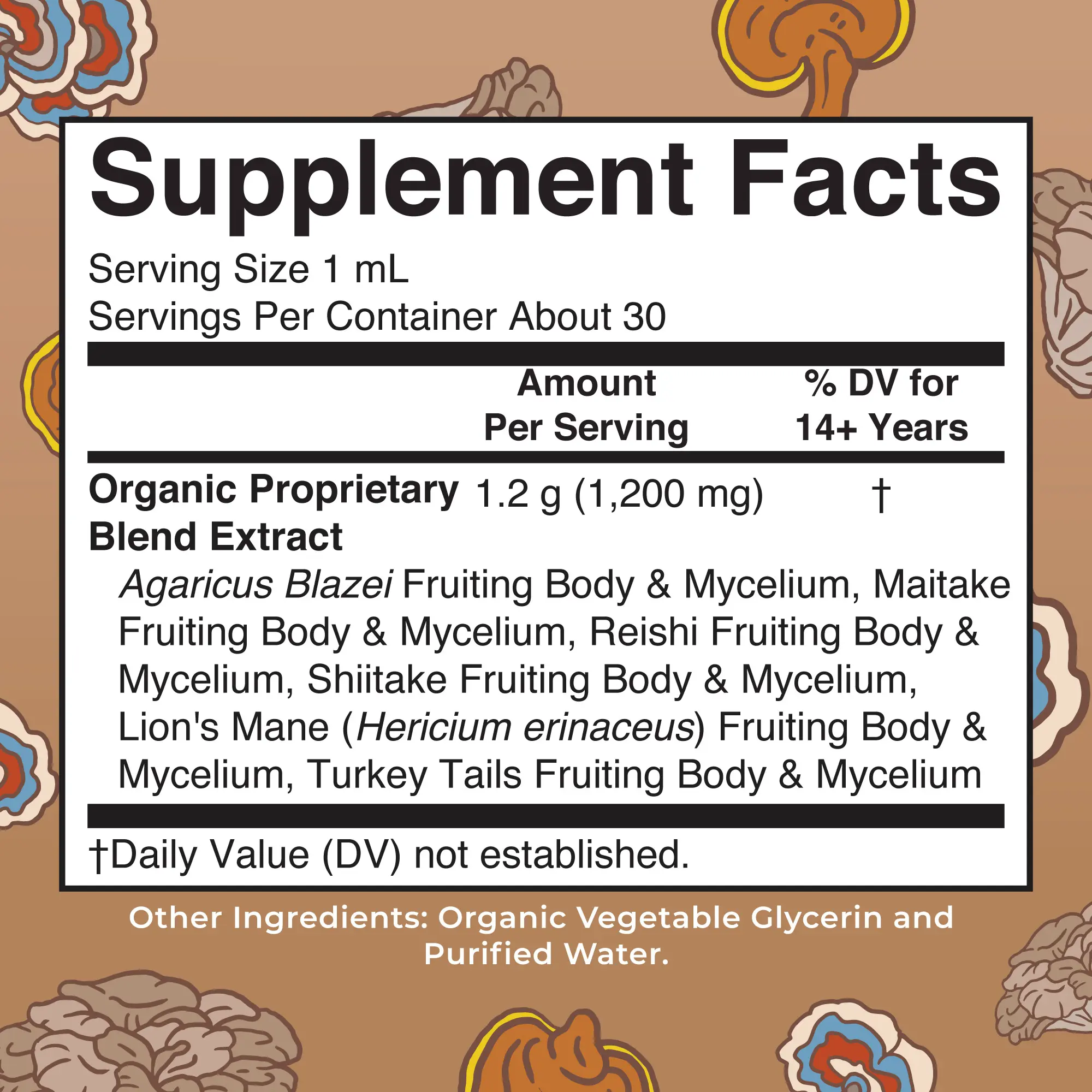 Organic Mushroom Supplement: The individual amounts of each botanical in the botanical blend are proprietary, so the dry herb amount in our botanical blends accounts for all the dry herbs of the proprietary blend. Each serving (1 mL) contains 1.2 g (1200 mg) Organic Proprietary Blend Extract, with a Dry Herb to Menstruum Ratio of 1:16 (approx. 61 mg dry herb equivalent per 1 mL).